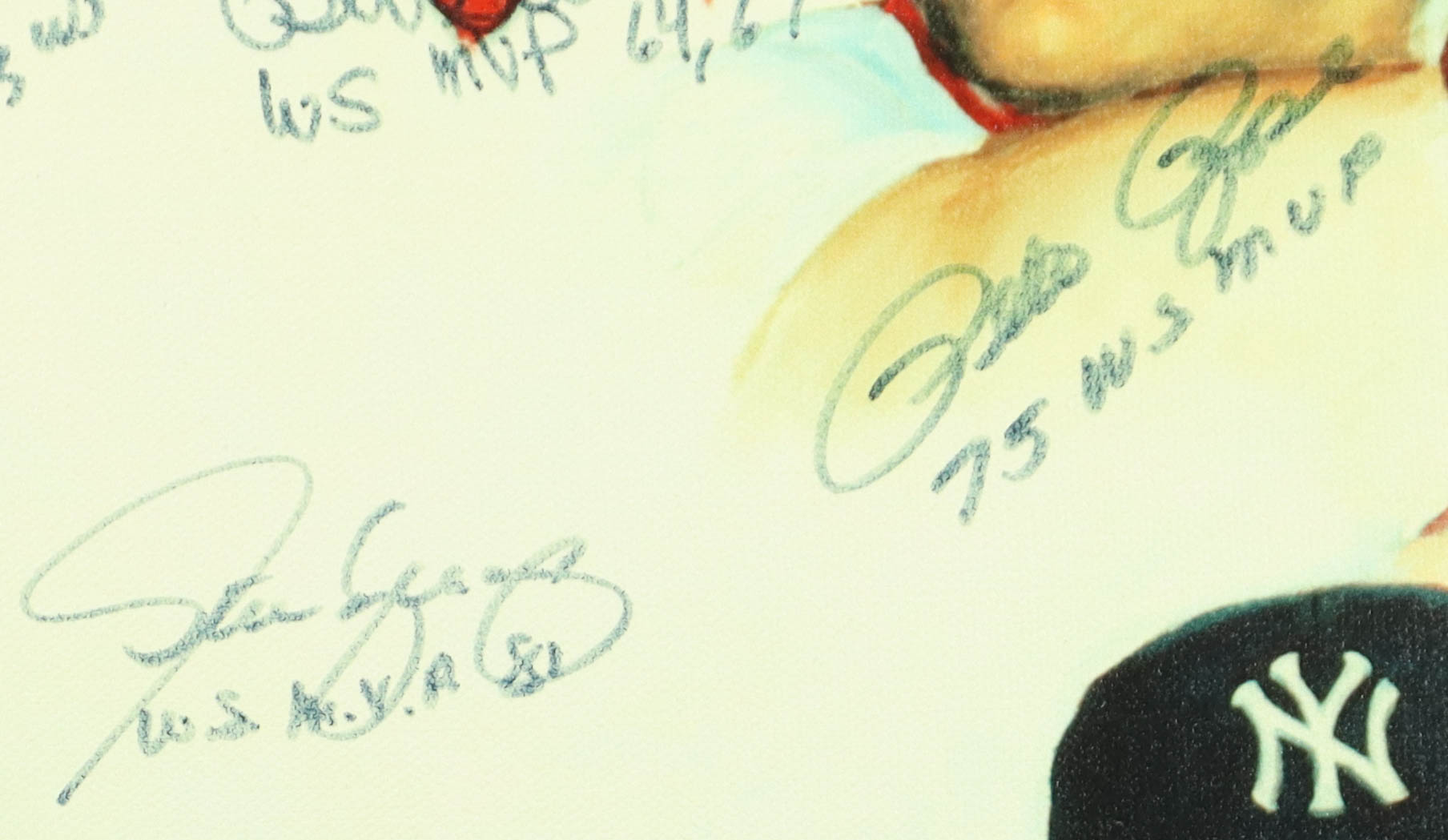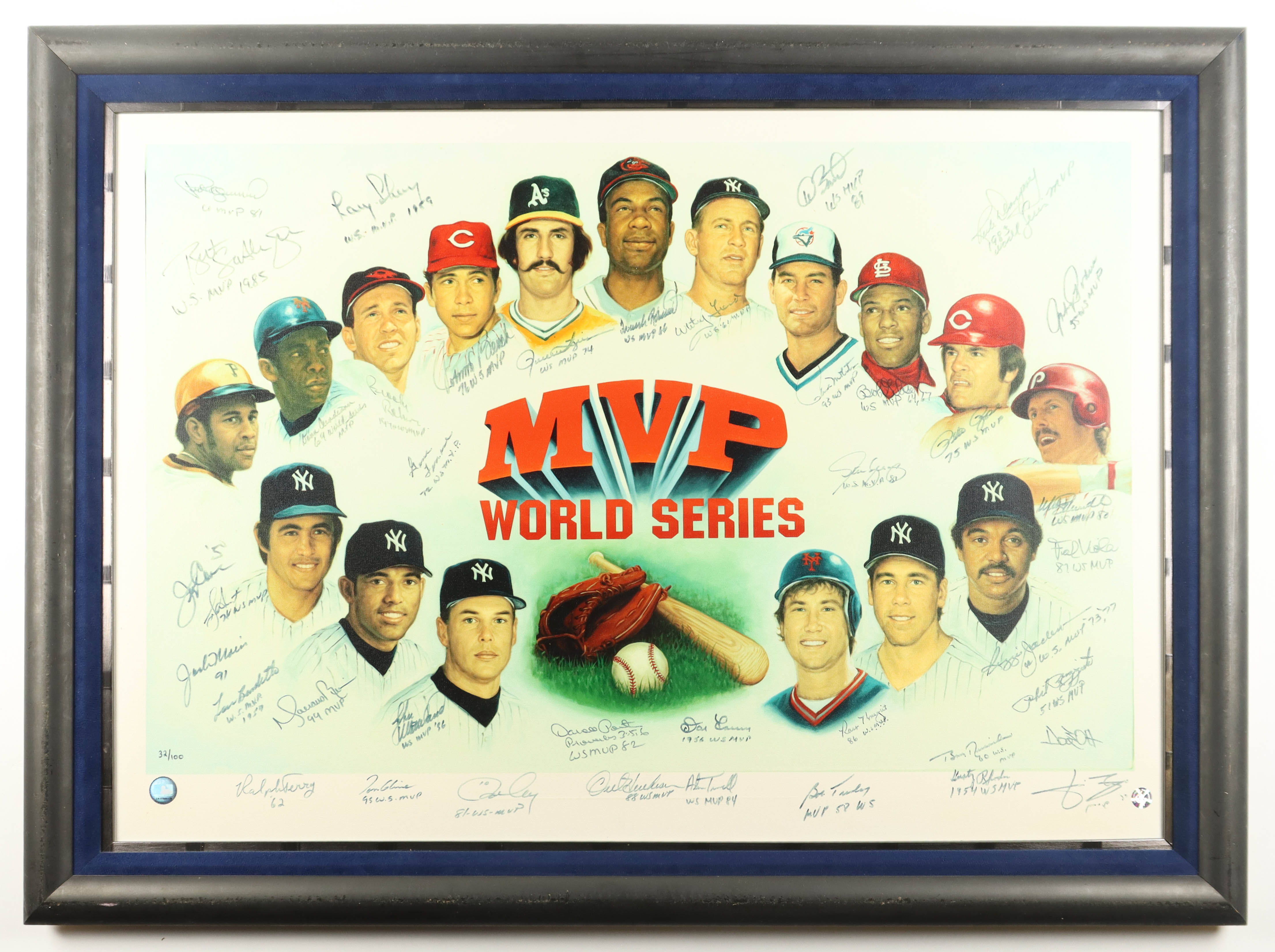 Custom frame measures approximately 32" x 43" in size and features a lithograph on canvas that has been hand-signed and inscribed by (37) World Series MVP's including Hall of Famers Johnny Bench, Mariano Rivera, and Reggie Jackson! This item is limited edition and has been numbered #32/100!
