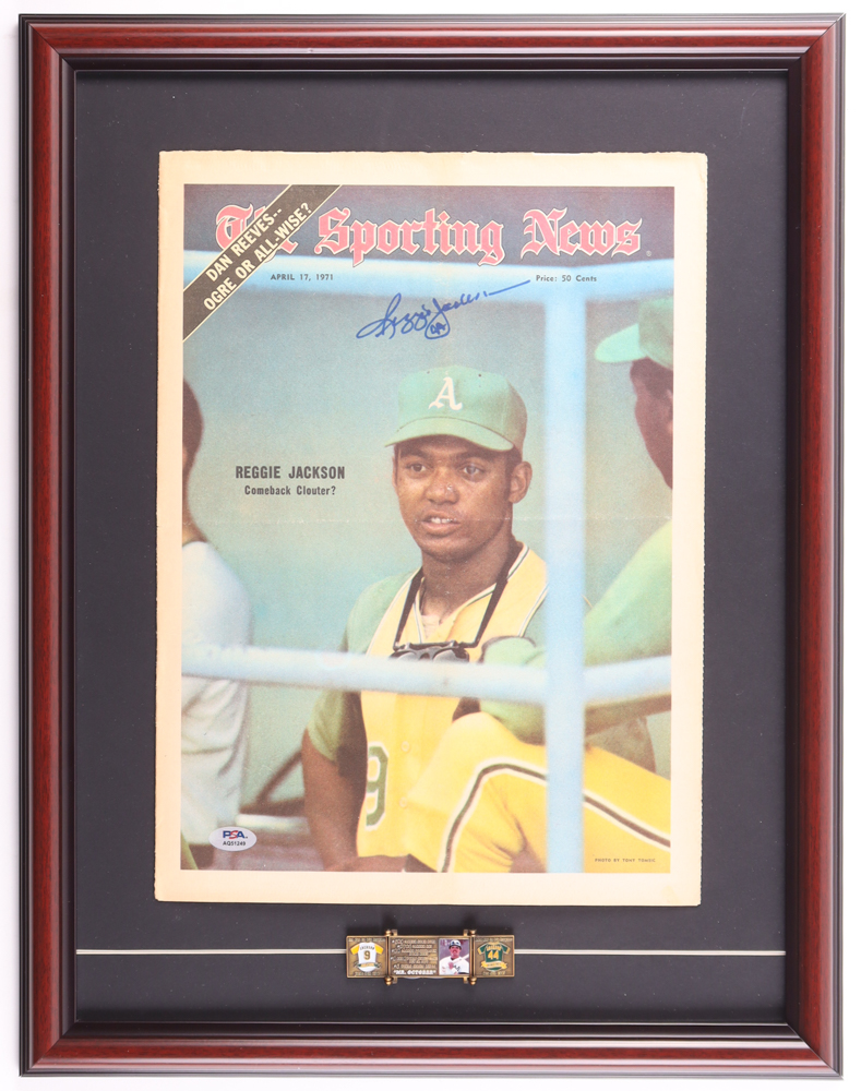 Custom frame measures approximately 17" x 22" in size and features a April 17, 1971 "The Sporting News" newspaper article that has been hand-signed by Reggie Jackson (Oakland Athletics, HOF). Display also includes a vintage commemorative Reggie Jackson pin. Please see to photos for more details regarding the condition of the item.