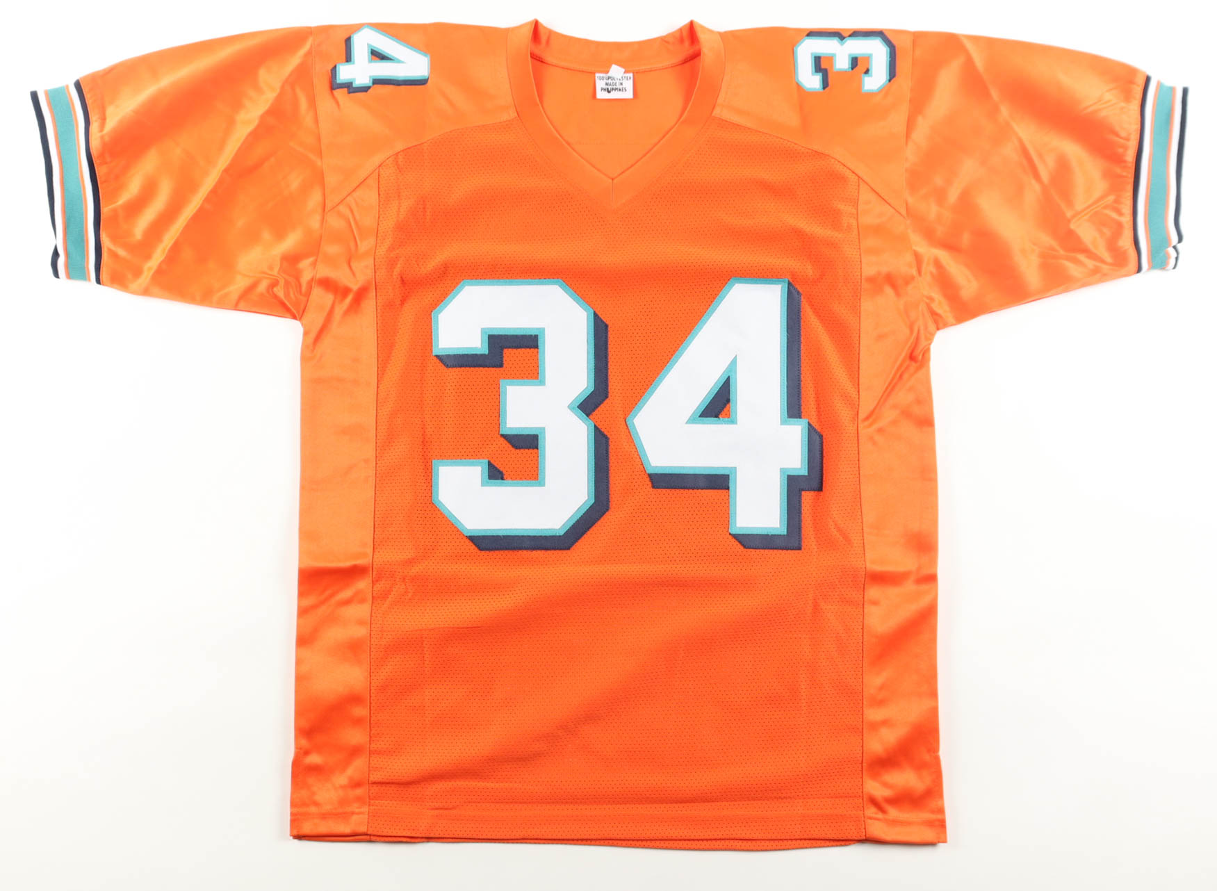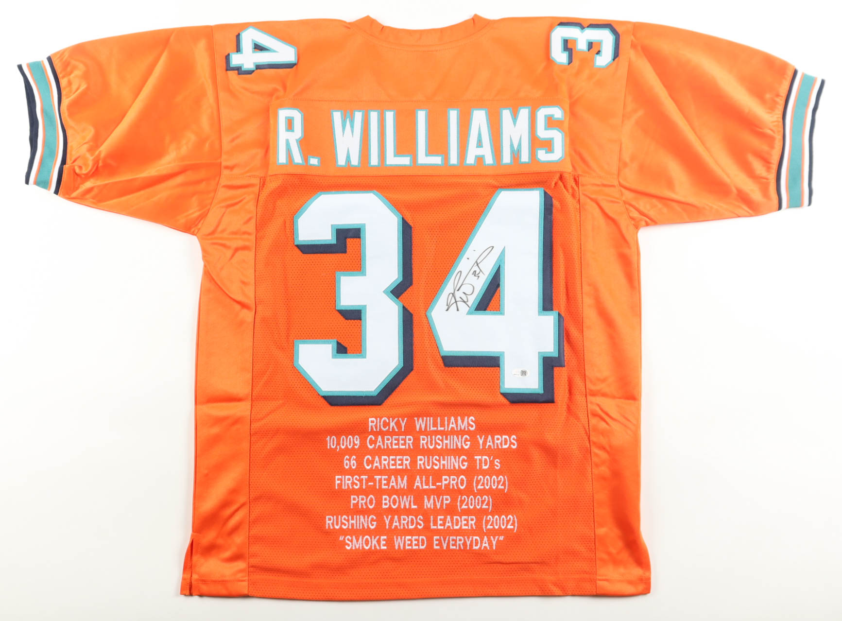 Custom jersey with everything sewn on, size XL. Has been hand-signed by Ricky Williams. Williams's career highlights have been custom stitched onto the back of the jersey below the reverse numbers.
