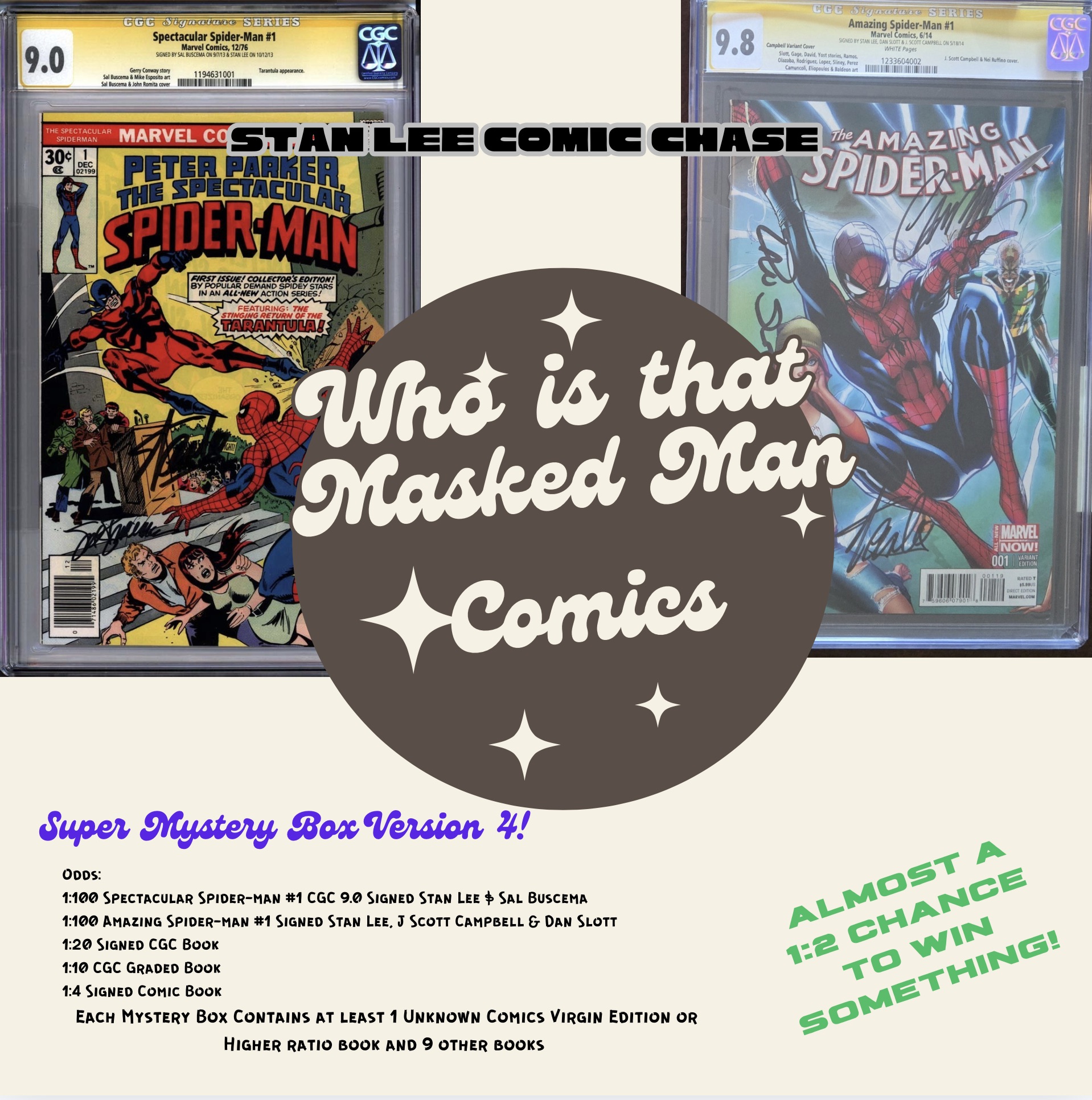 Each “Stan Lee Chase” Mystery Pack includes a guaranteed set of Ten Bagged and Boarded Comic Books, with a chance to win a Spectacular Spider-man #1 from 1976 signed by Stan Lee (died.2018) and cover artist Sal Buscema (died.2026) or Amazing Spider-Man #1 CGC 9.8 (Highest Graded) Signed by Stan Lee, J Scott Campbell & Dan Slott , that’s a 1:50 chance to win a book from Stan “the Man” Lee.