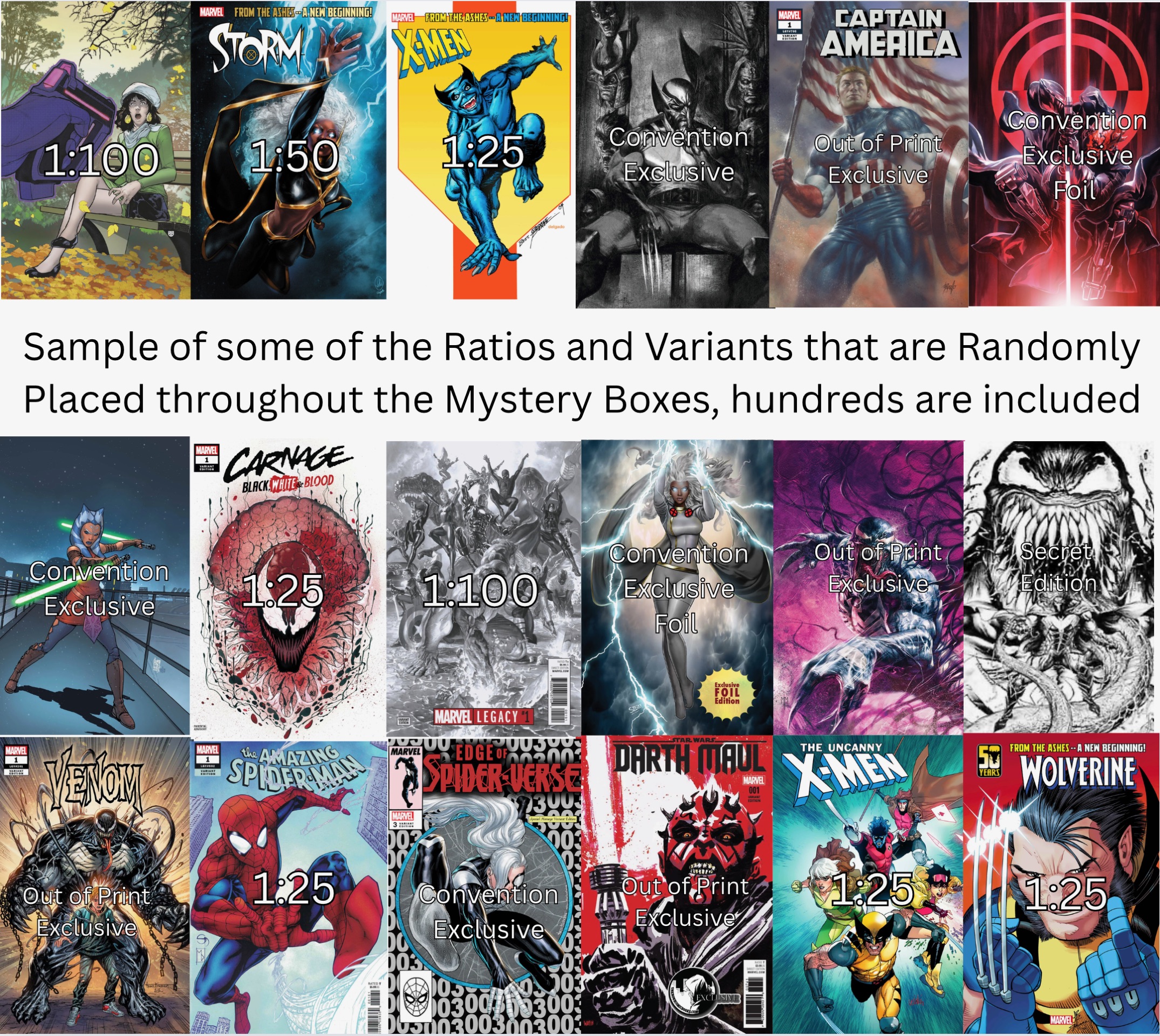 Other great books will be included! Every box is a winner with at least one Exclusive Virgin or Variant (1:25 or Higher) included along with 9 other books from publishers like Marvel, DC, Image, Dark Horse and others. Many boxes will include multiple Virgins, Trade Dress, Foil and Ratio books.
