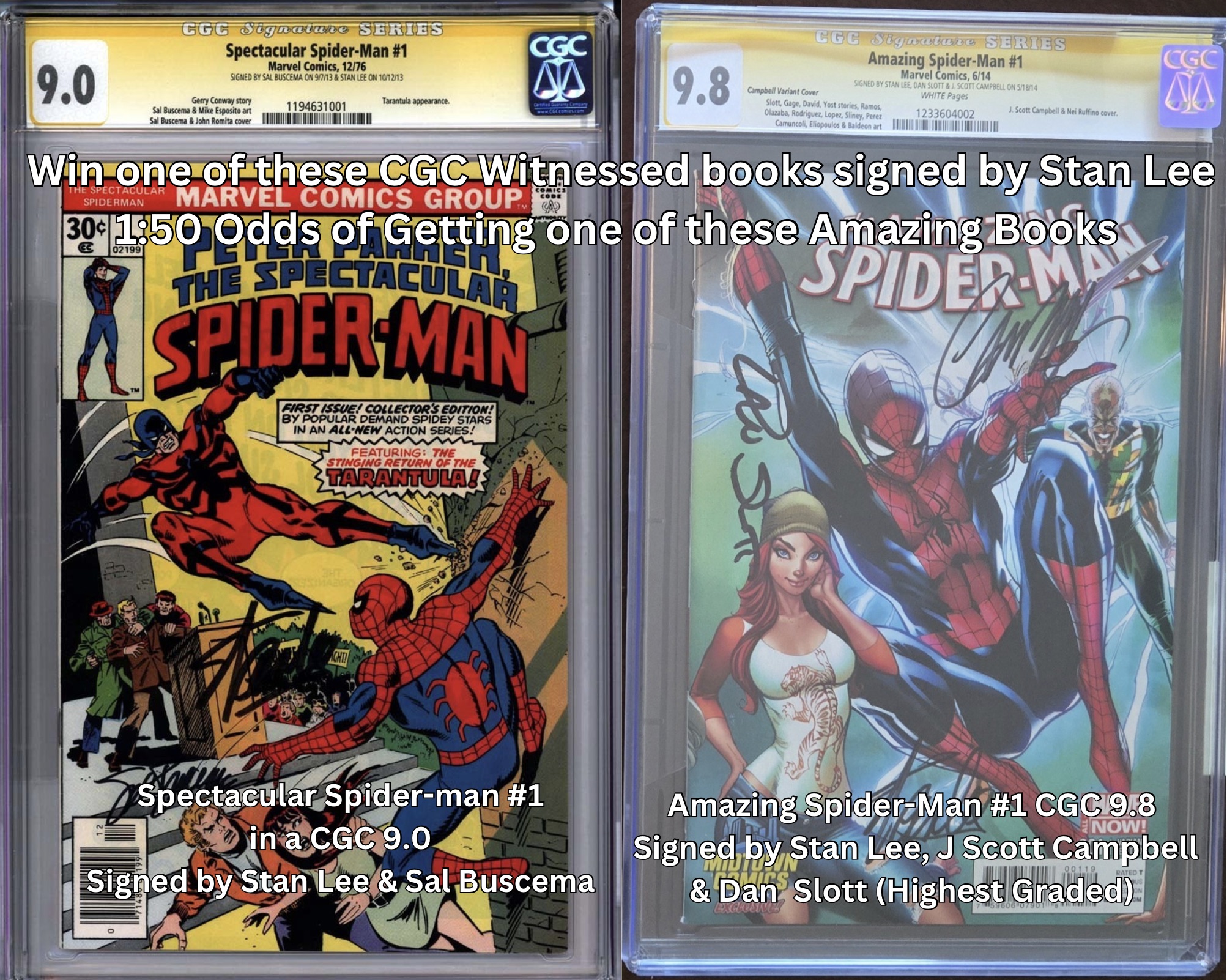 Own a piece of Marvel History with a chance to win a Major Key with Spectacular Spider-man #1 from 1976 signed by Stan Lee (died.2018) and cover artist Sal Buscema (died.2026) in a CGC 9.0 or Amazing Spider-Man #1 from in a CGC 9.8 Signed by Stan Lee, J Scott Campbell & Dan Slott!