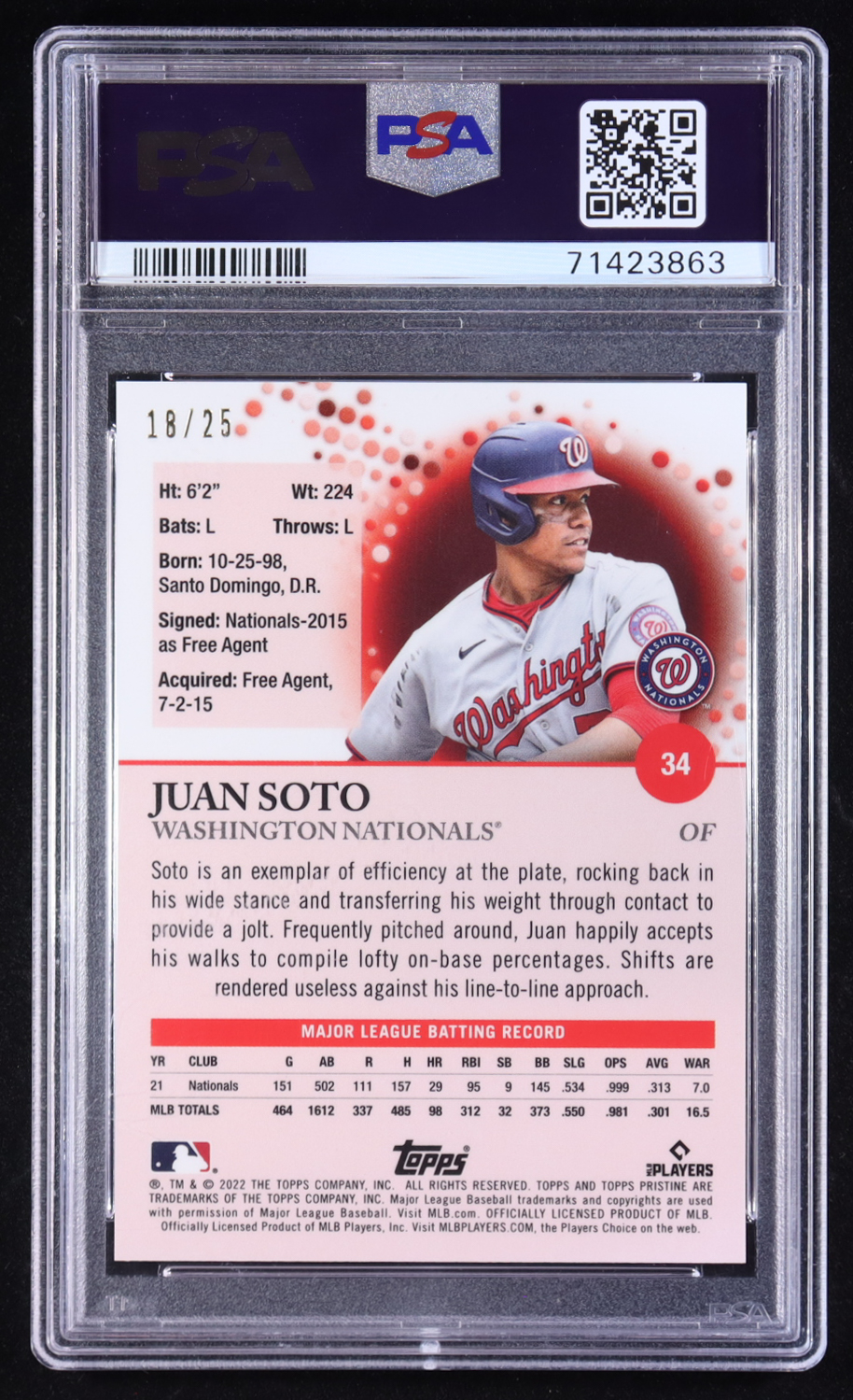 Juan Soto 2022 Topps Pristine Orange Refractor #34 #18/25 (PSA 10)