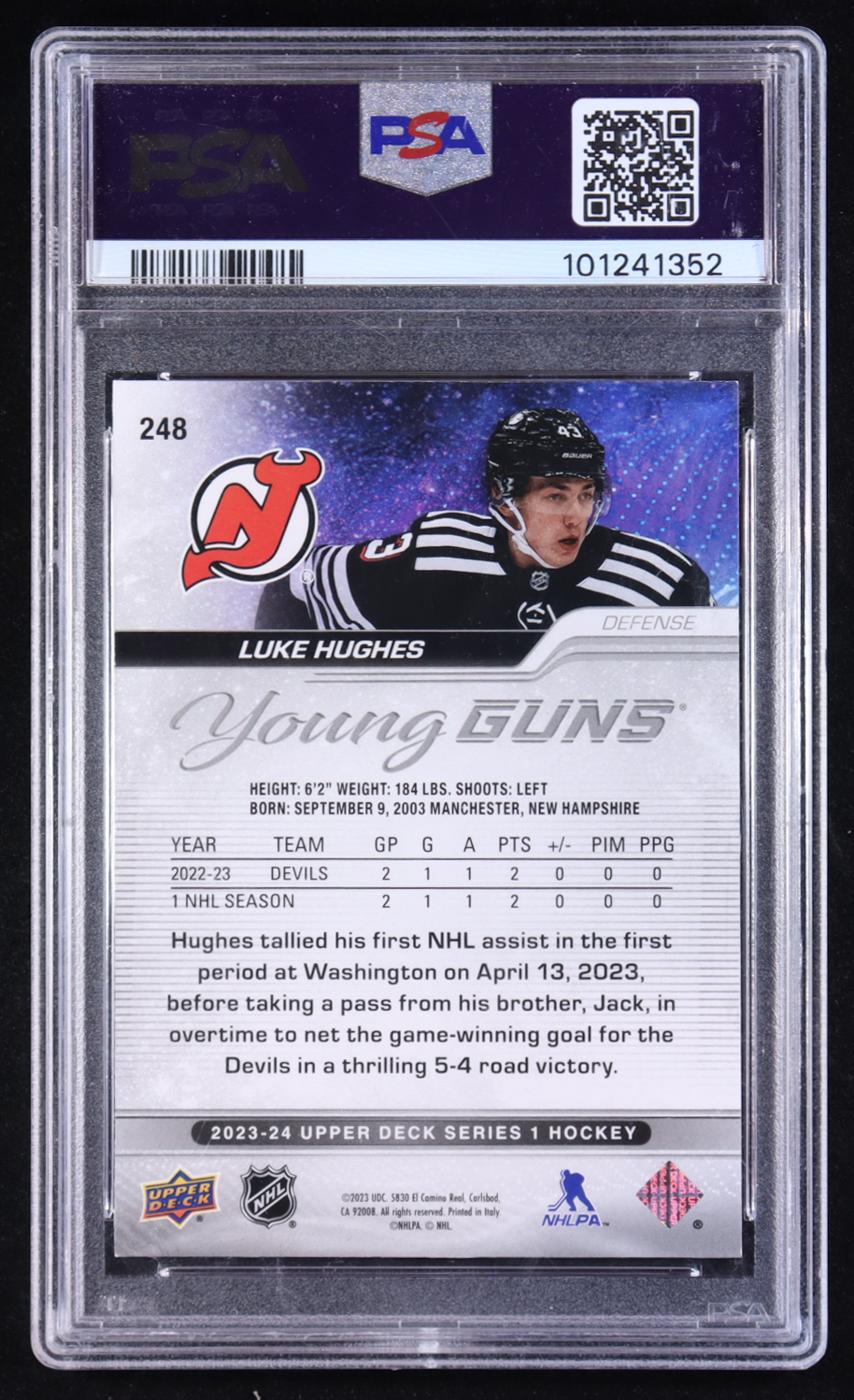 Luke Hughes 2023-24 Upper Deck Series 1 Outburst Young Guns Silver #248 RC (PSA 9)