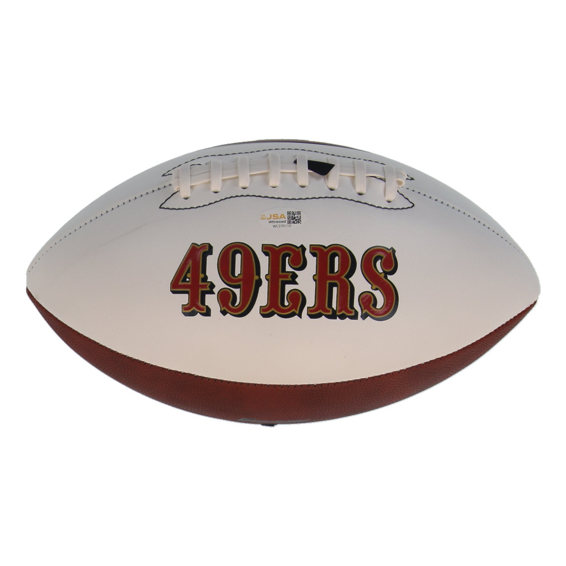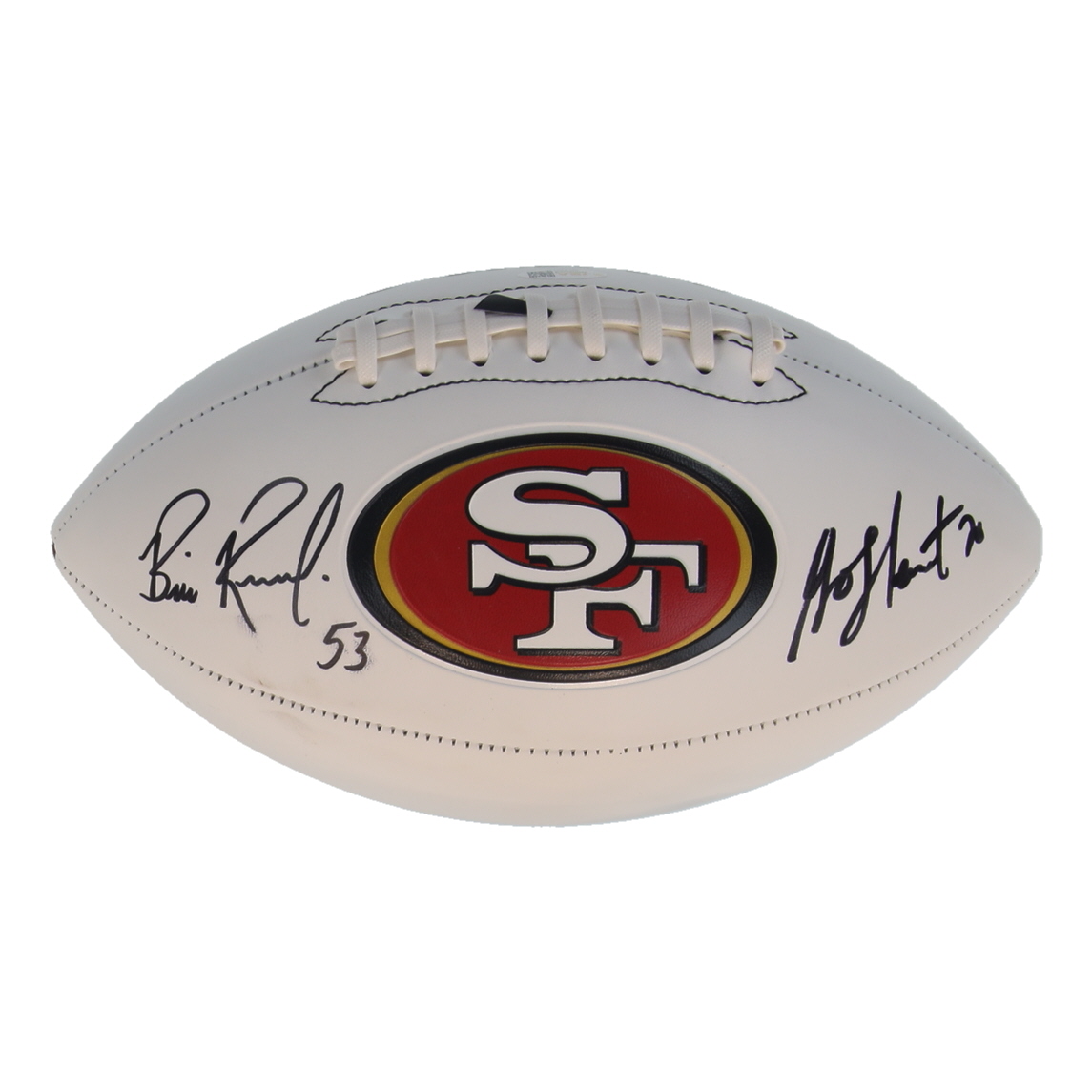 Franklin San Francisco 49ers Logo Football. Hand-signed by Bill Romanowski and Garrison Hearst. Please note, Bill Romanowski's signature has been smudged and there are stains throughout the football.