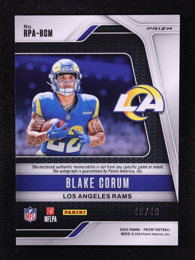 Blake Corum 2024 Panini Prizm Rookie Patch Autographs Prizm Purple Power #12 RC #49/49