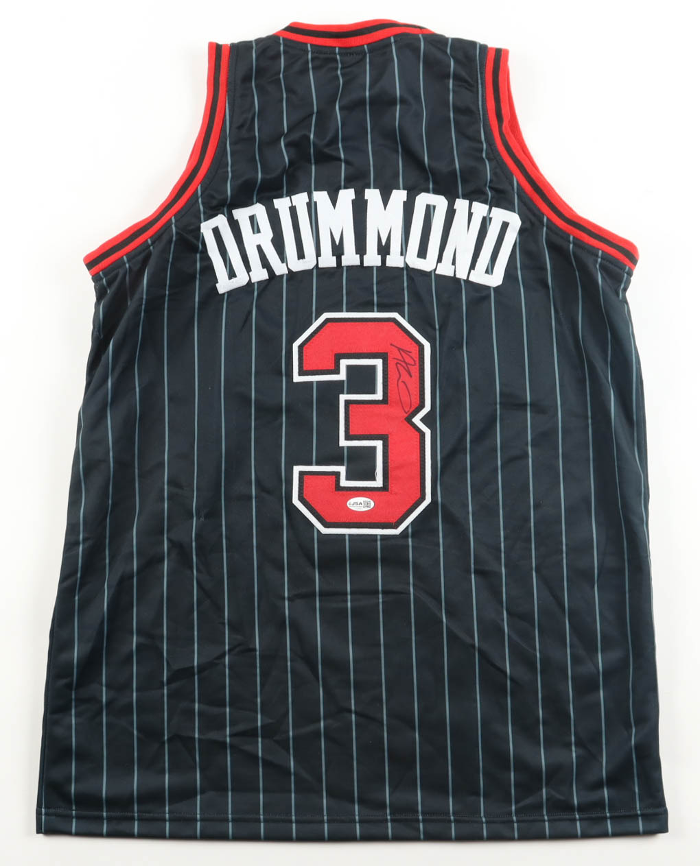 Custom jersey with everything sewn on, size L. Hand-signed by Andre Drummond.