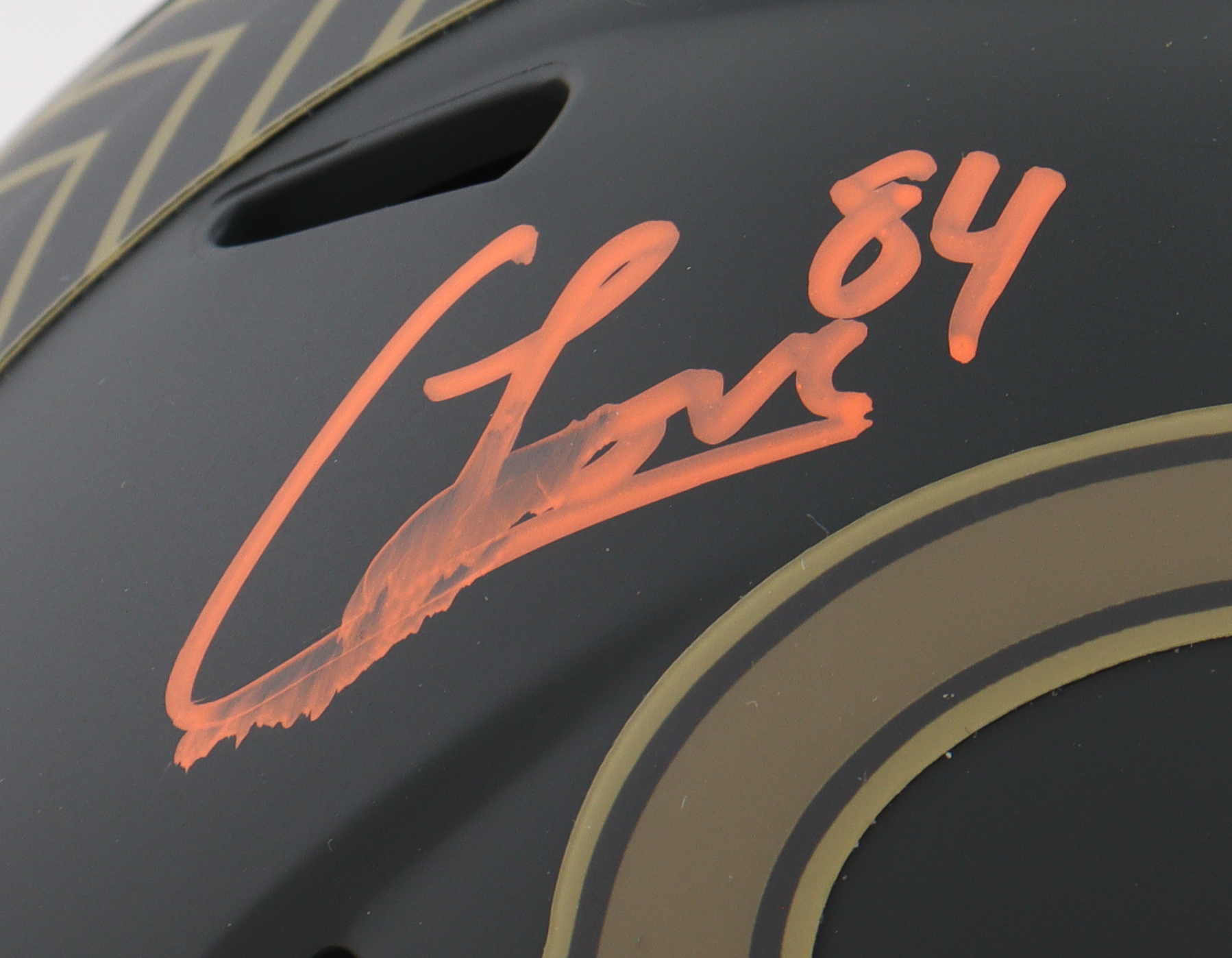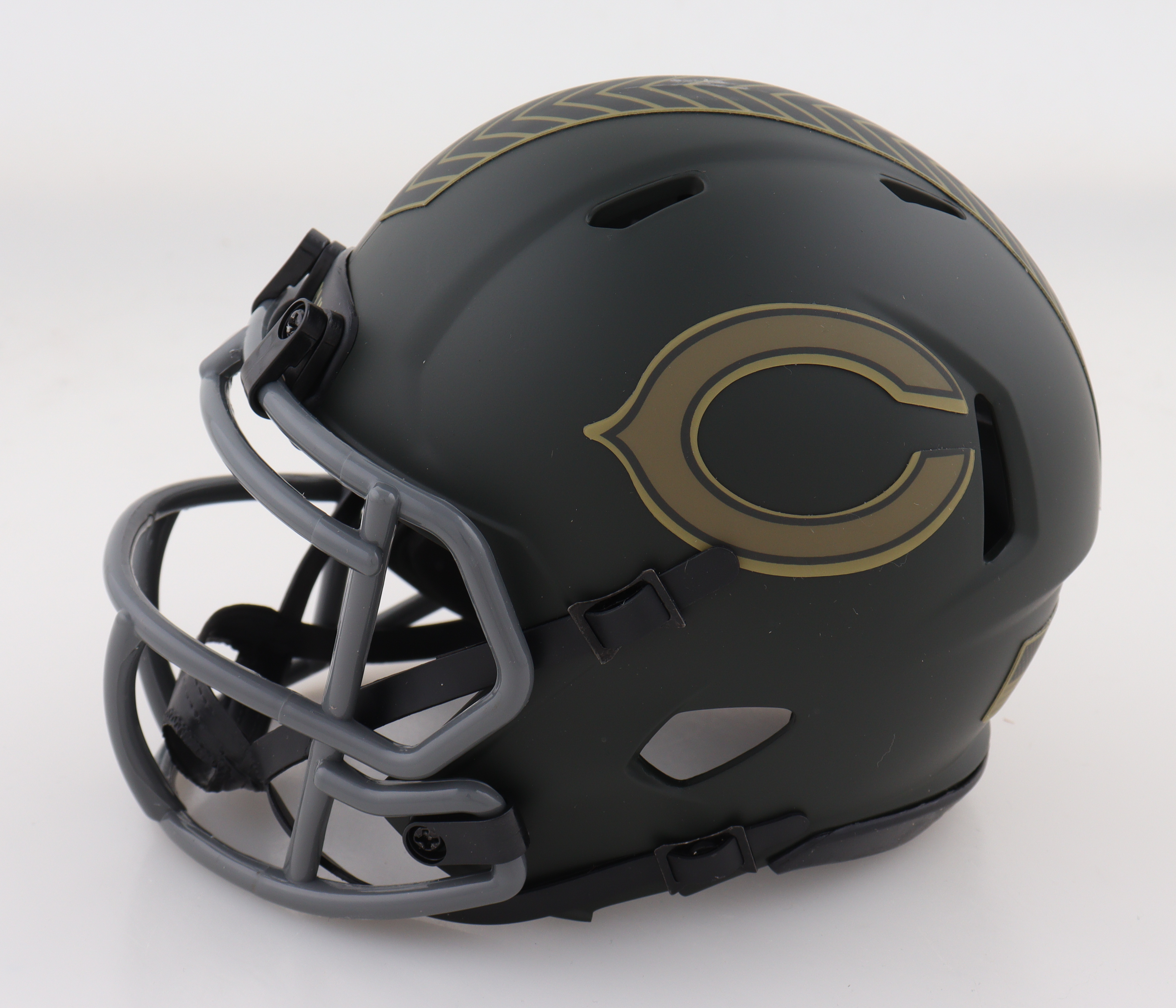 Riddell Chicago Bears Salute to Service Alternate Speed Mini Helmet. Hand-signed by Colston Loveland. Please note, the signature has been smudged.