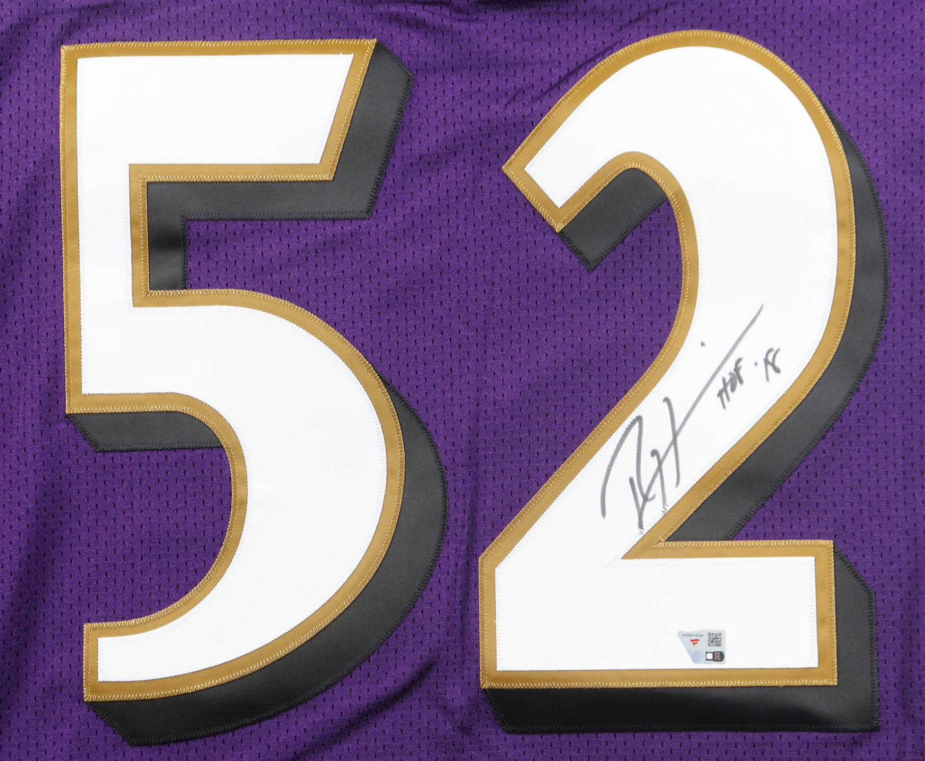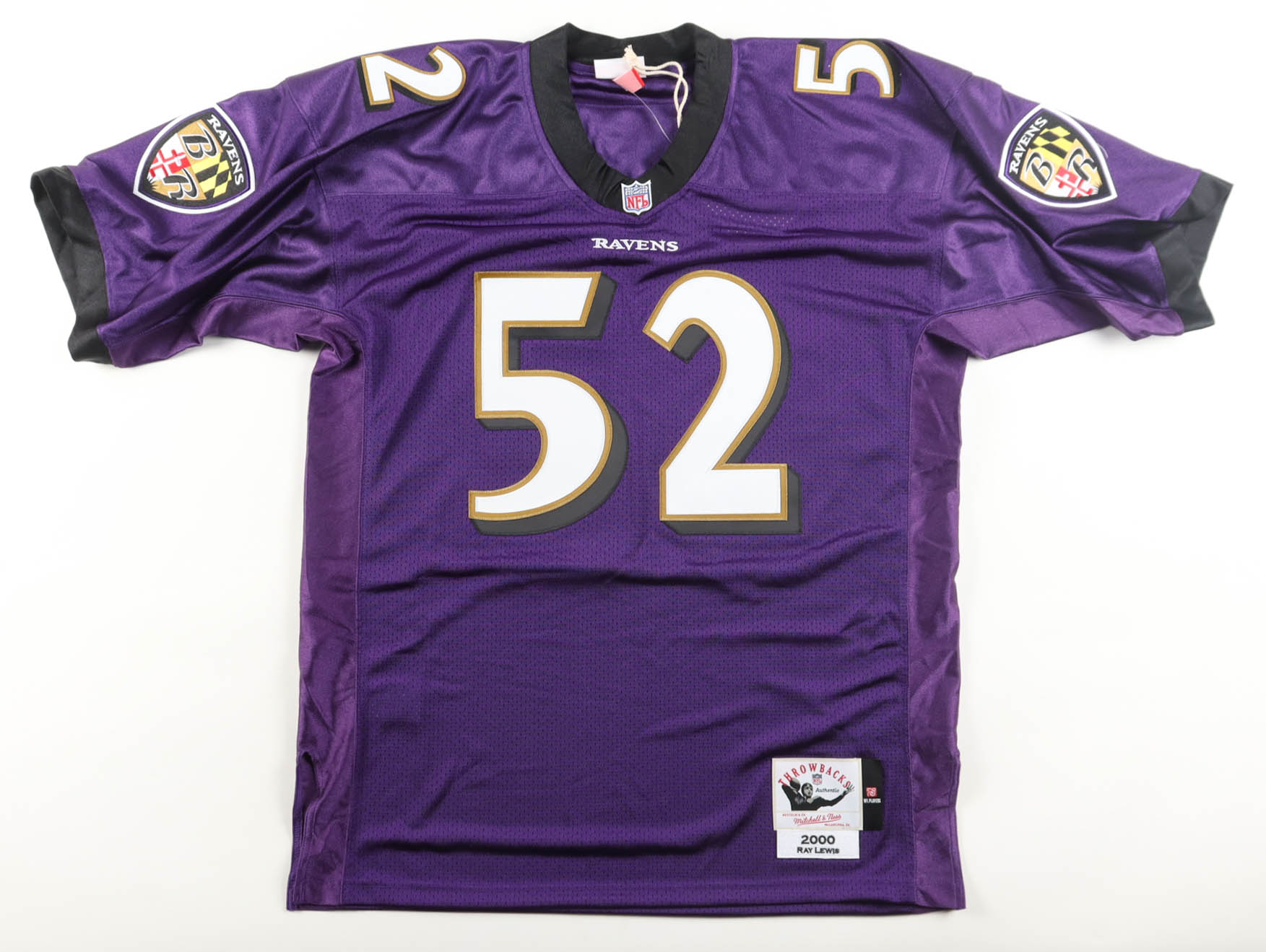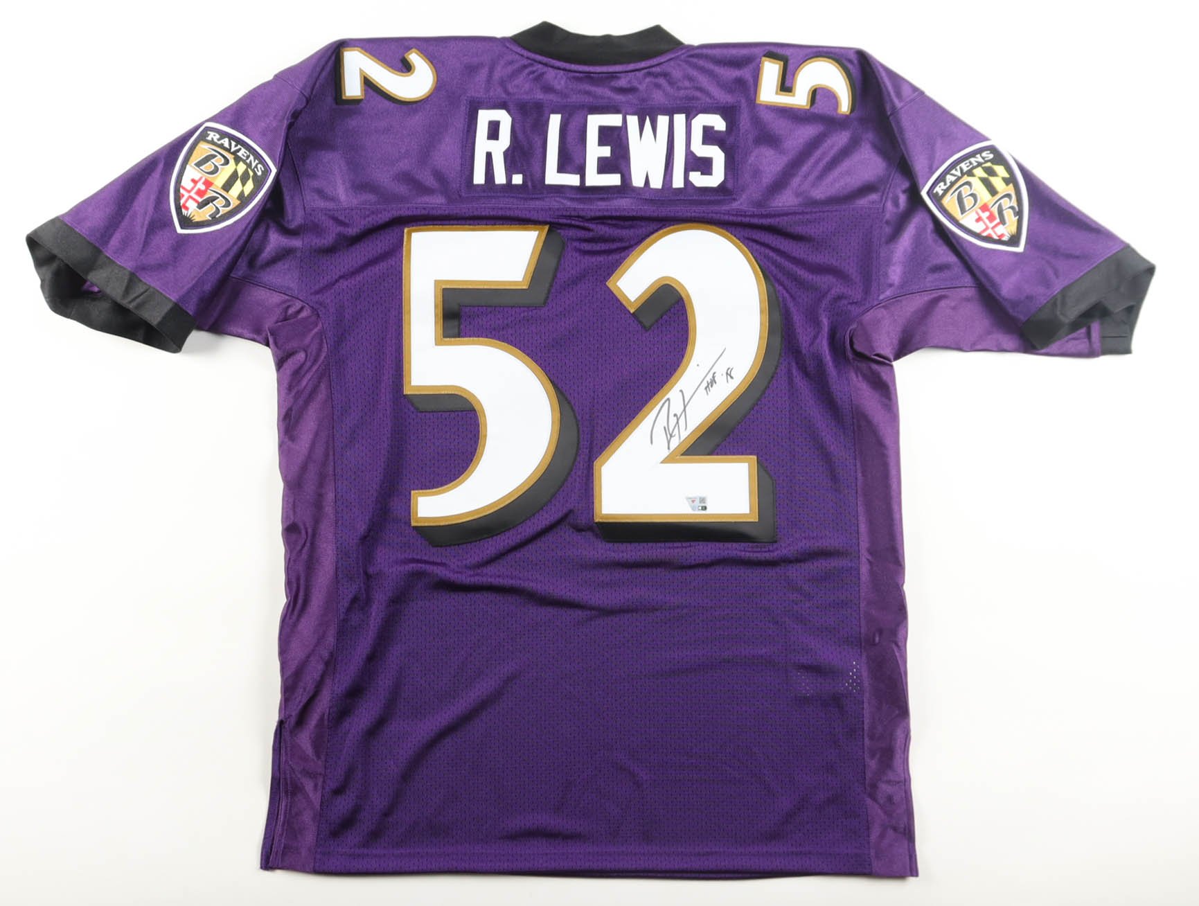 Mitchell & Ness jersey with everything sewn on, size XL. Hand-signed and inscribed by Ray Lewis (Baltimore Ravens, HOF).