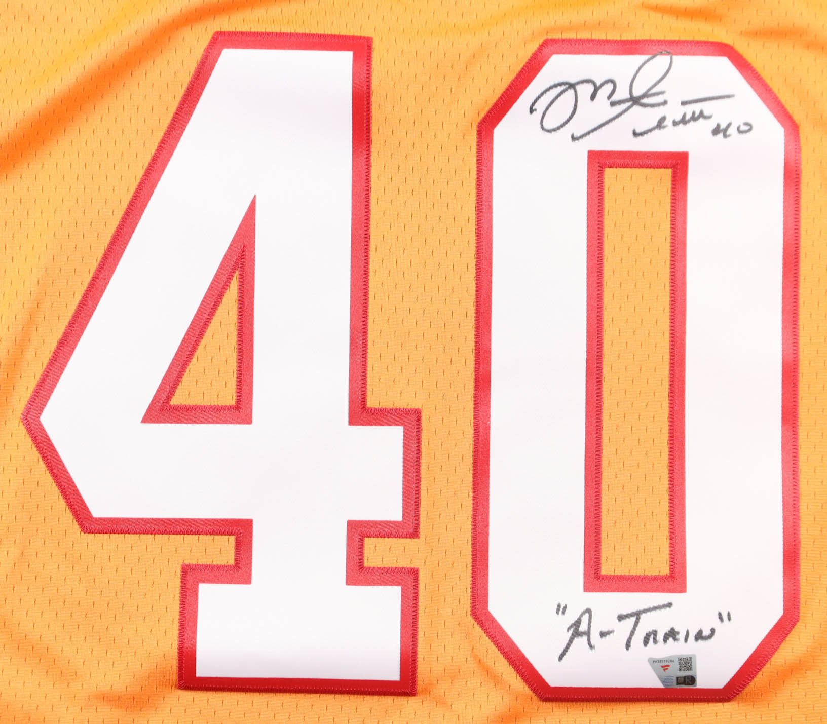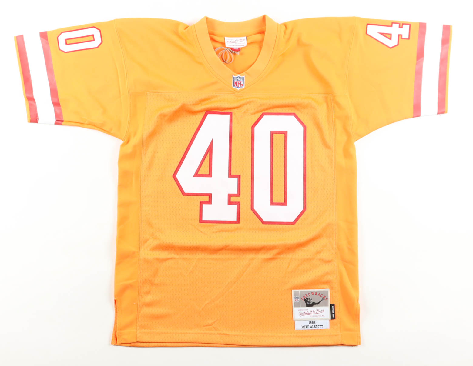 Mitchell & Ness jersey with everything sewn on, size 40 (M). Hand-signed and inscribed by Mike Alstott (Tampa Bay Buccaneers).