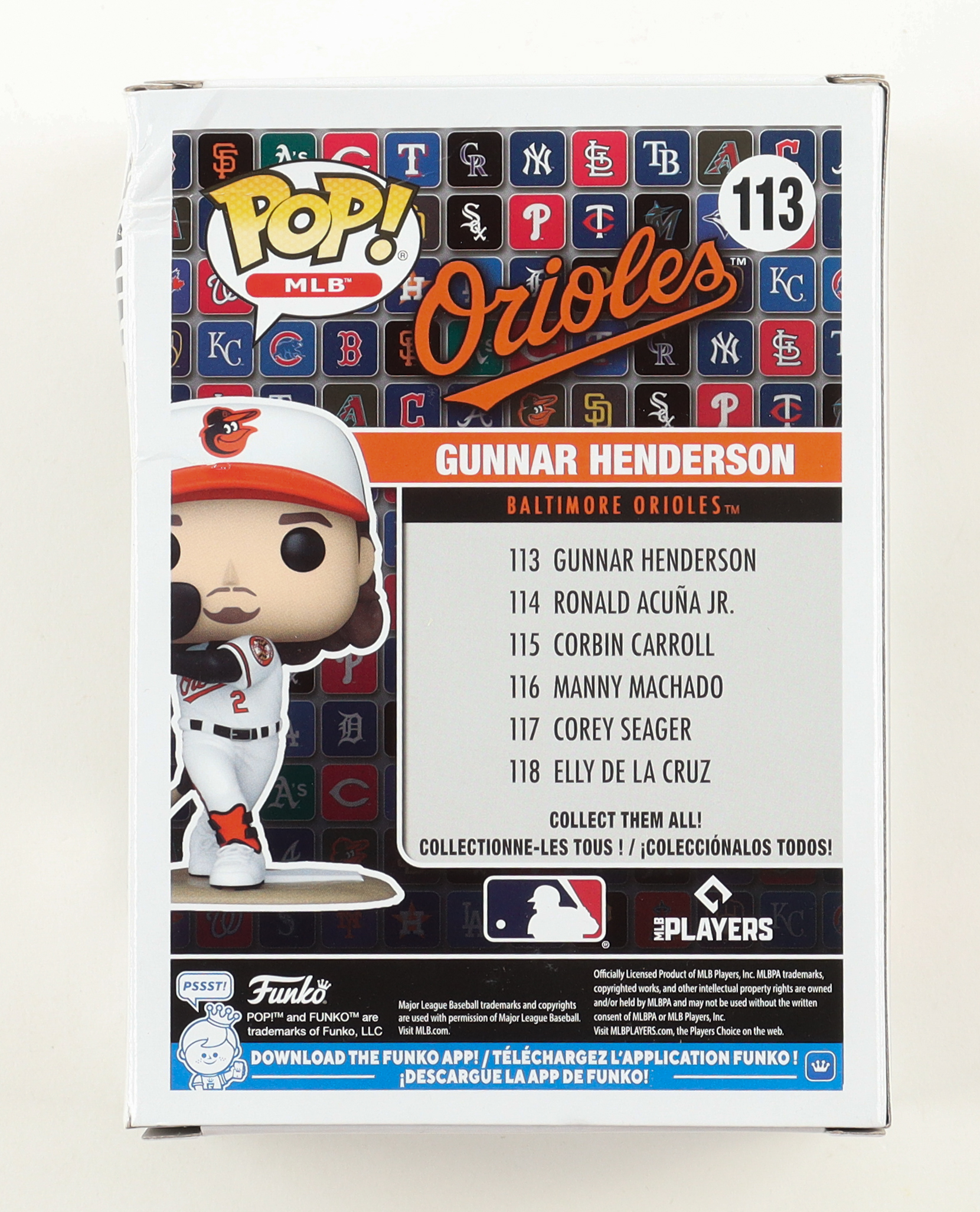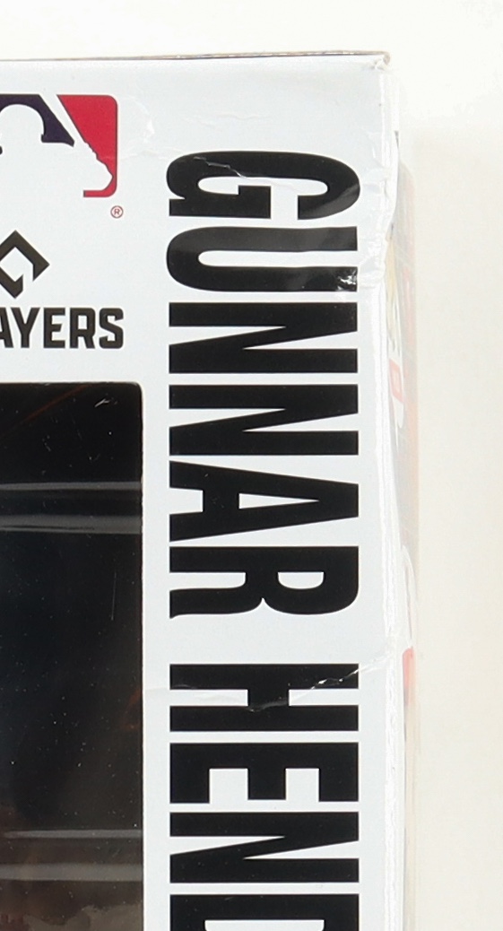 Vinyl figure measures approximately 4" tall and has been hand-signed by Gunnar Henderson (Baltimore Orioles). Please note, there are significant creases throughout the packaging.