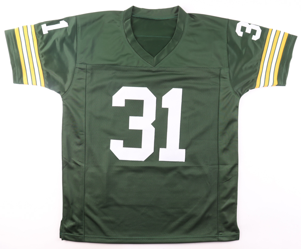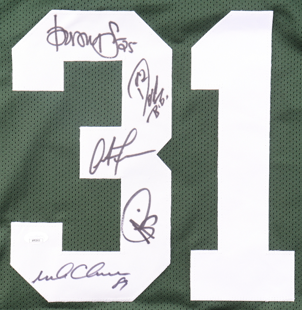 Custom jersey. Everything is sewn on, size XL. Hand-signed by Dorsey Levens, Don Beebe, Antonio Freeman, Andre Rison and Mark Chmura. Highlights have been custom stitched onto the back of the jersey below the reverse numbers.v
