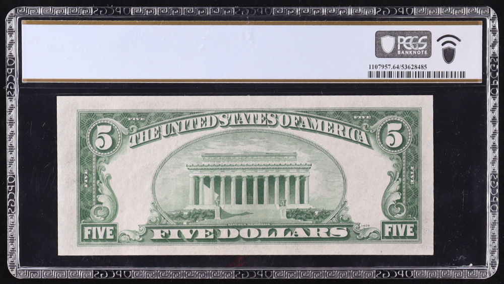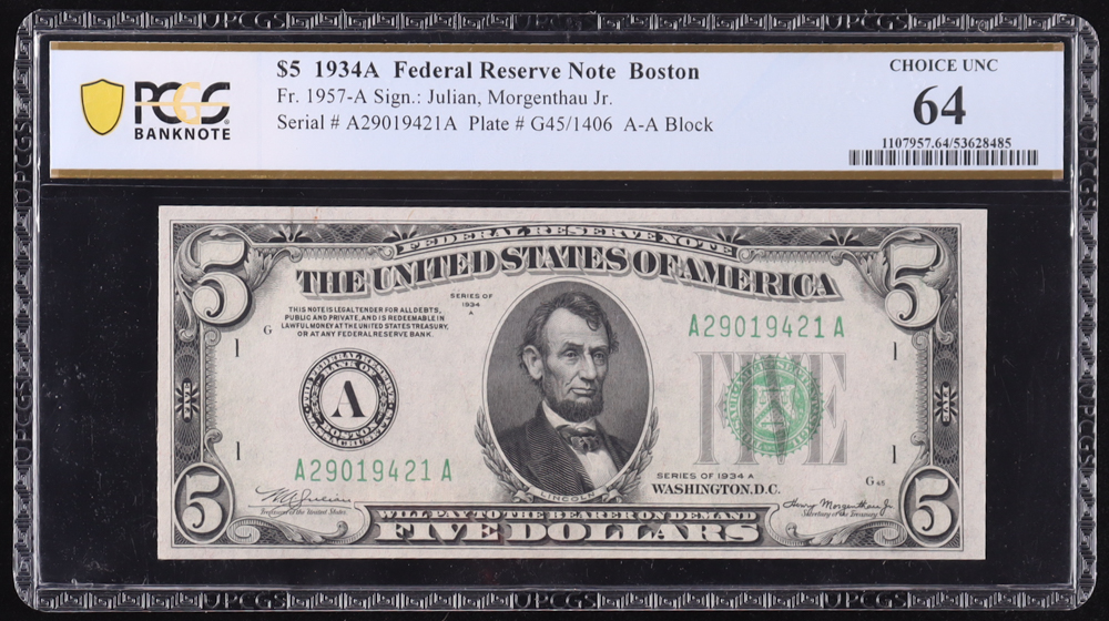 1934-A U.S. $5 Federal Reserve Note, Boston - Fr. 1957-A (AA Block) Signed: Julian / Morgenthau (PCGS Choice Unc 64)