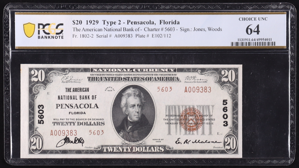 1929 U.S. $20 National Currency Note, Type 2 - The American NB Pensacola, FL Charter# 5603 - Fr. 1802-2 Signed: Jones / Woods (PCGS Choice Unc 64)