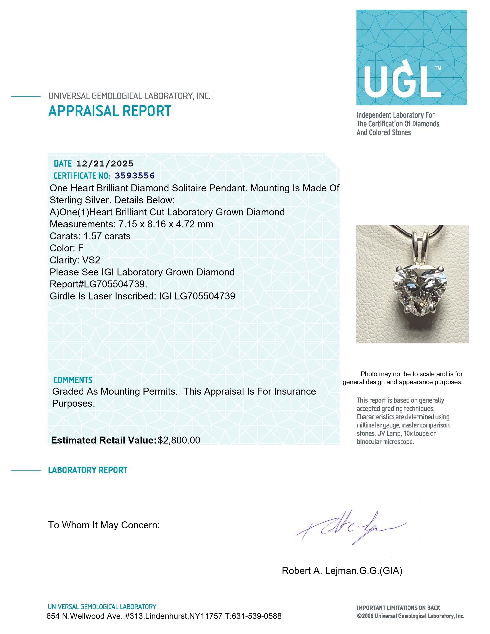 1.57 Carats Lab Grown Diamond Pendant F, VS2 | $2,800 Estimated Retail Value (UGL & IGI Certs) | Brand New