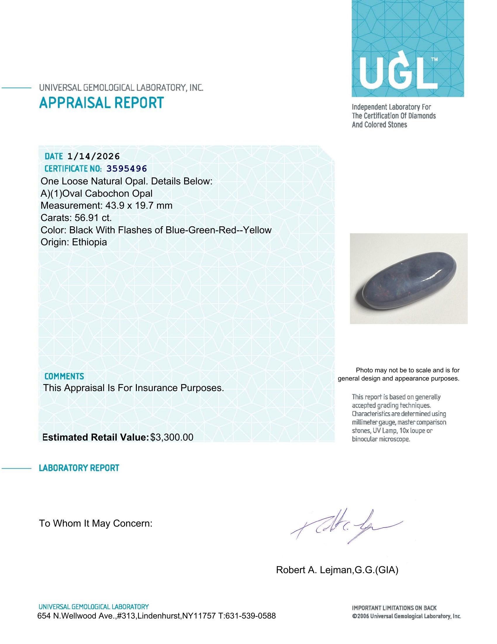 56.91 Carats Natural Black Opal Loose| $3,300 Estimated Retail Value (UGL Cert)