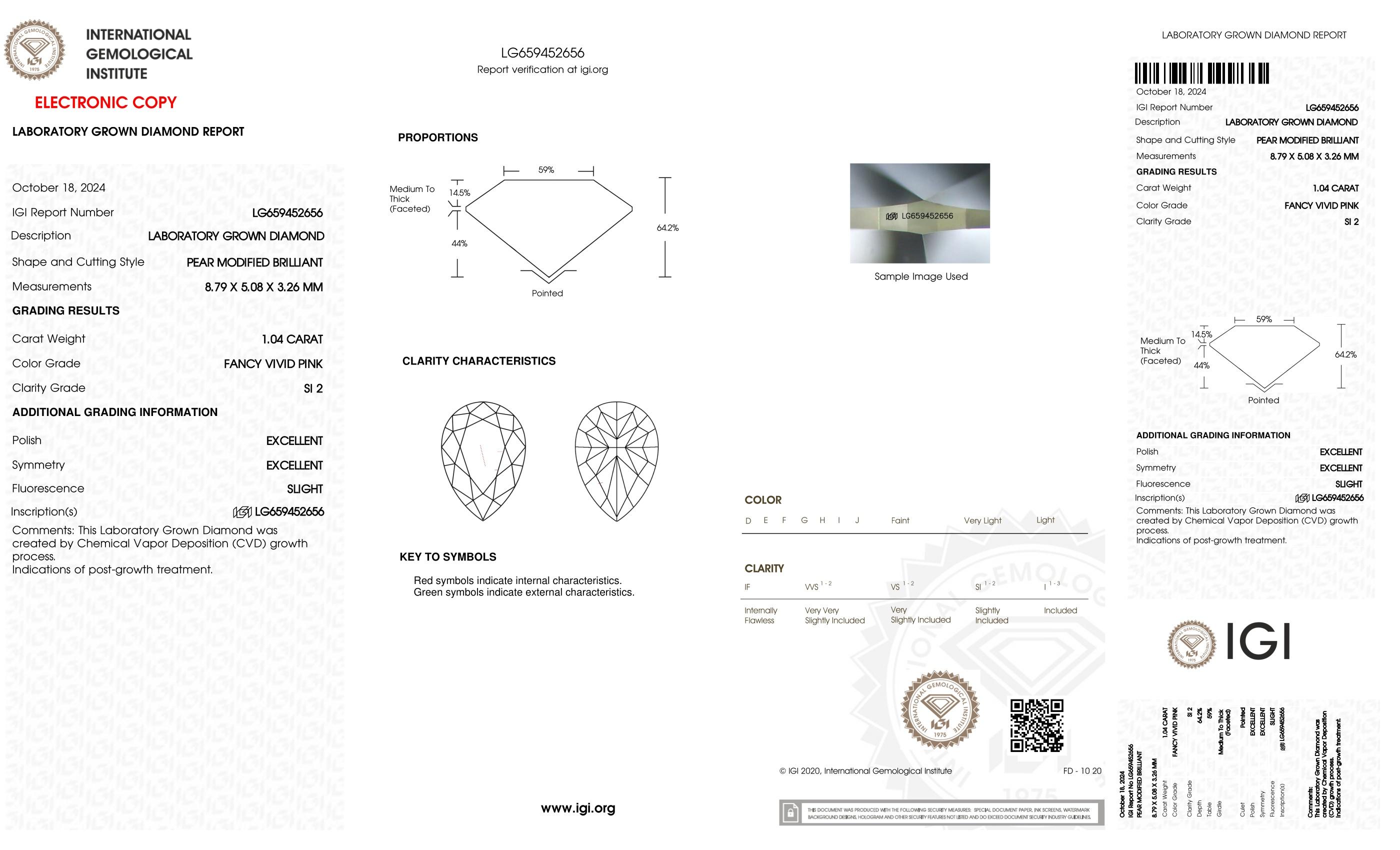 1.04 Carats Lab Grown FANCY VIVID PINK Diamond Loose SI2 | IGI Cert