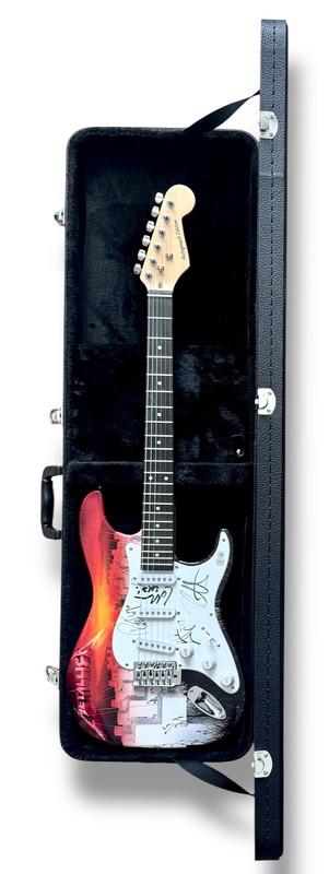 Custom Autograph Edition Stratocaster style electric guitar measures approximately 39" in length and has been hand-signed on the Pickguard by James Hetfield (Lead Singer & Guitarist), Kirk Hammet (Lead Guitarist) and Robert Trujillo (Lead Bassist) and Lars Ulrich (Drummer). Please note, the guitar includes a hardshell Gator Case.
