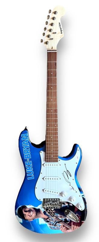 Custom Autograph Edition Stratocaster style electric guitar measures approximately 39" in length and has been hand-signed on the pickguard by Luke Bryan.