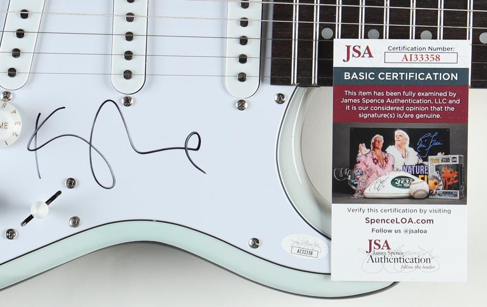 Electric guitar measures 39" has been hand-signed on the pick-guard by Kylie Minogue.