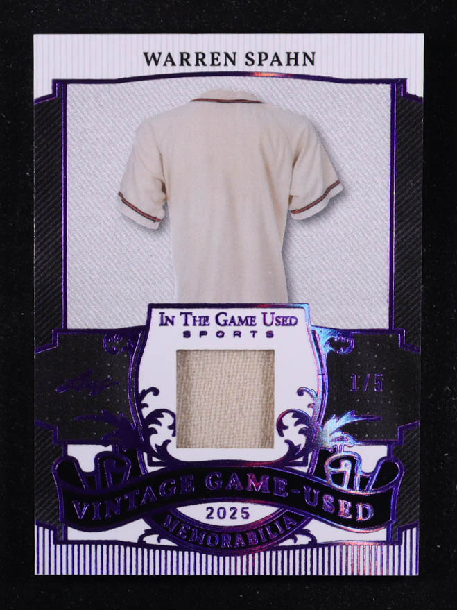 Warren Spahn 2025 Leaf ITG Used Sports Vintage Game Used Memorabilia Purple Foil JSY #VM15 #1/5