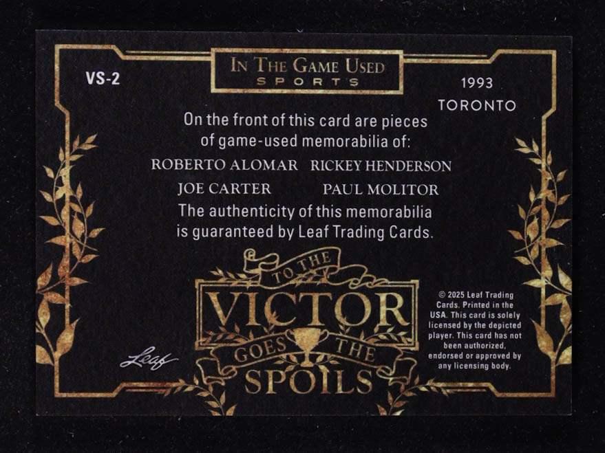 Roberto Alomar / Rickey Henderson / Joe Carter / Paul Molitor 2025 Leaf ITG Used Sports To The Victor Goes The Spoils Silver Sparkle Foil Relics #VS2 #2/15