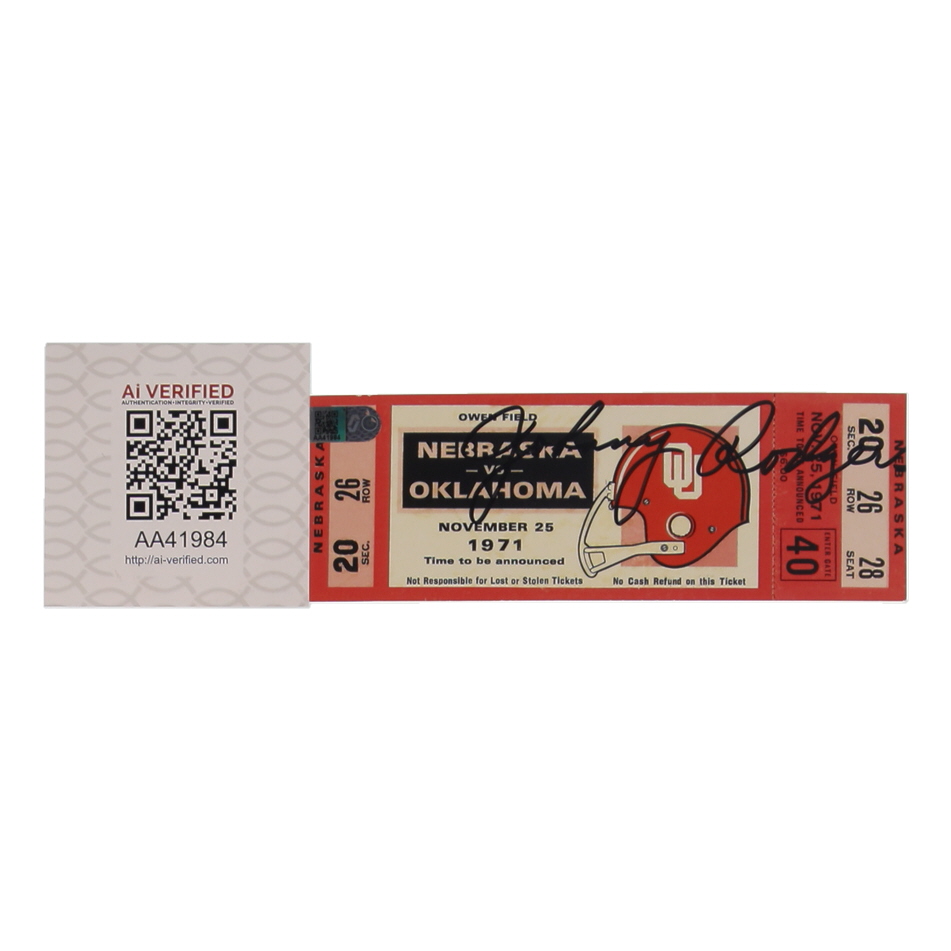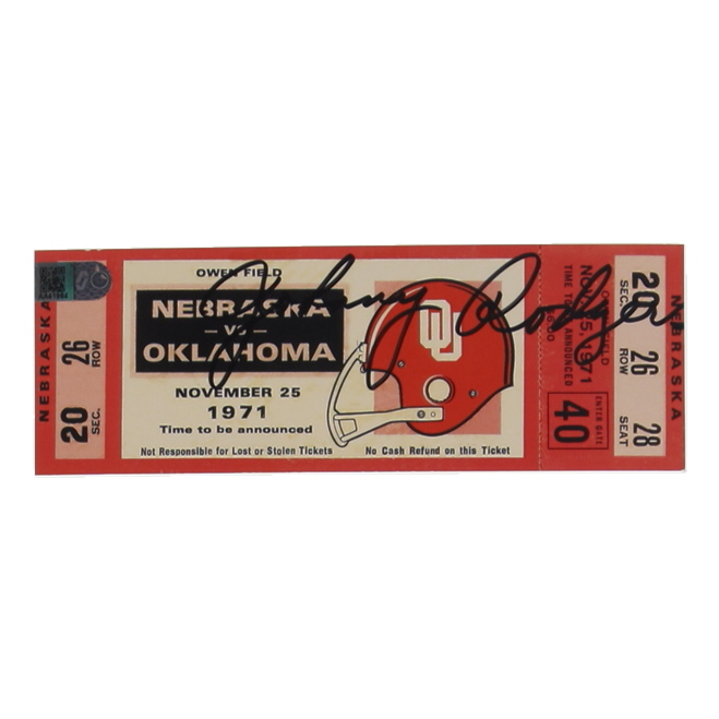 1971 replica game ticket for the game between the Nebraska Cornhuskers and Oklahoma Sooners has been hand-signed by Johnny Rodgers.