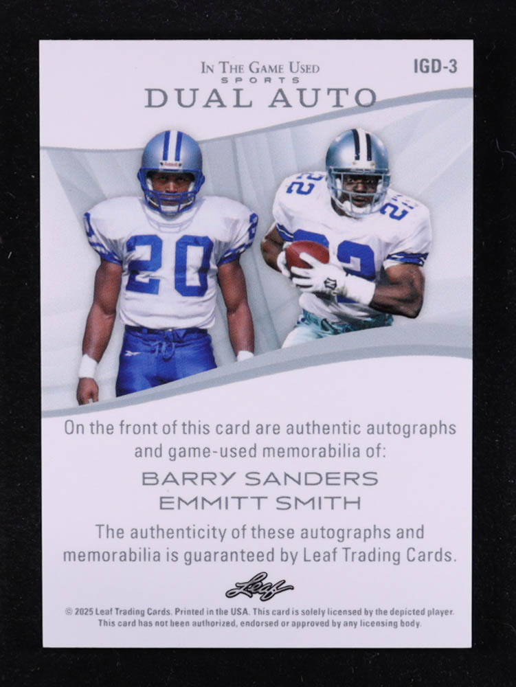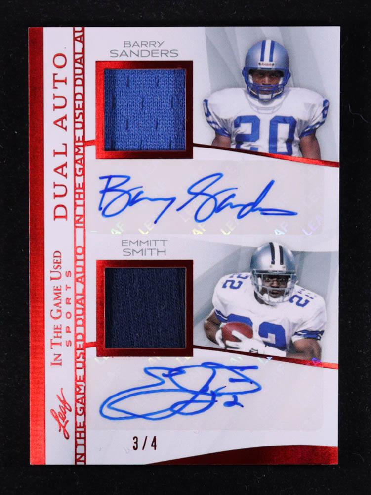 Barry Sanders / Emmitt Smith 2025 Leaf ITG Used Sports In the Game Used Dual Autograph Memorabilia Red #IGD3 #3/4
