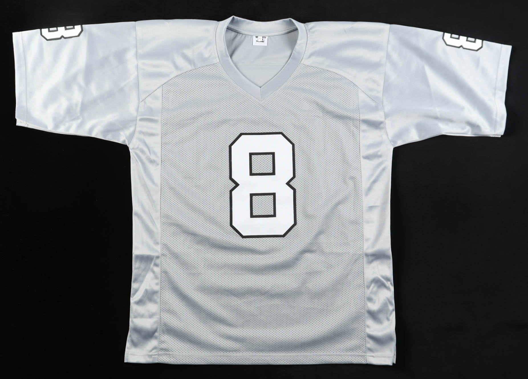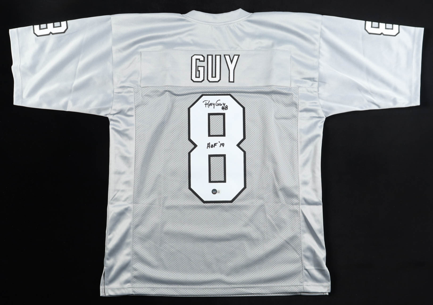 Custom jersey with everything sewn on, size XL. Hand-signed and inscribed by Ray Guy (D. 2022, HOF).