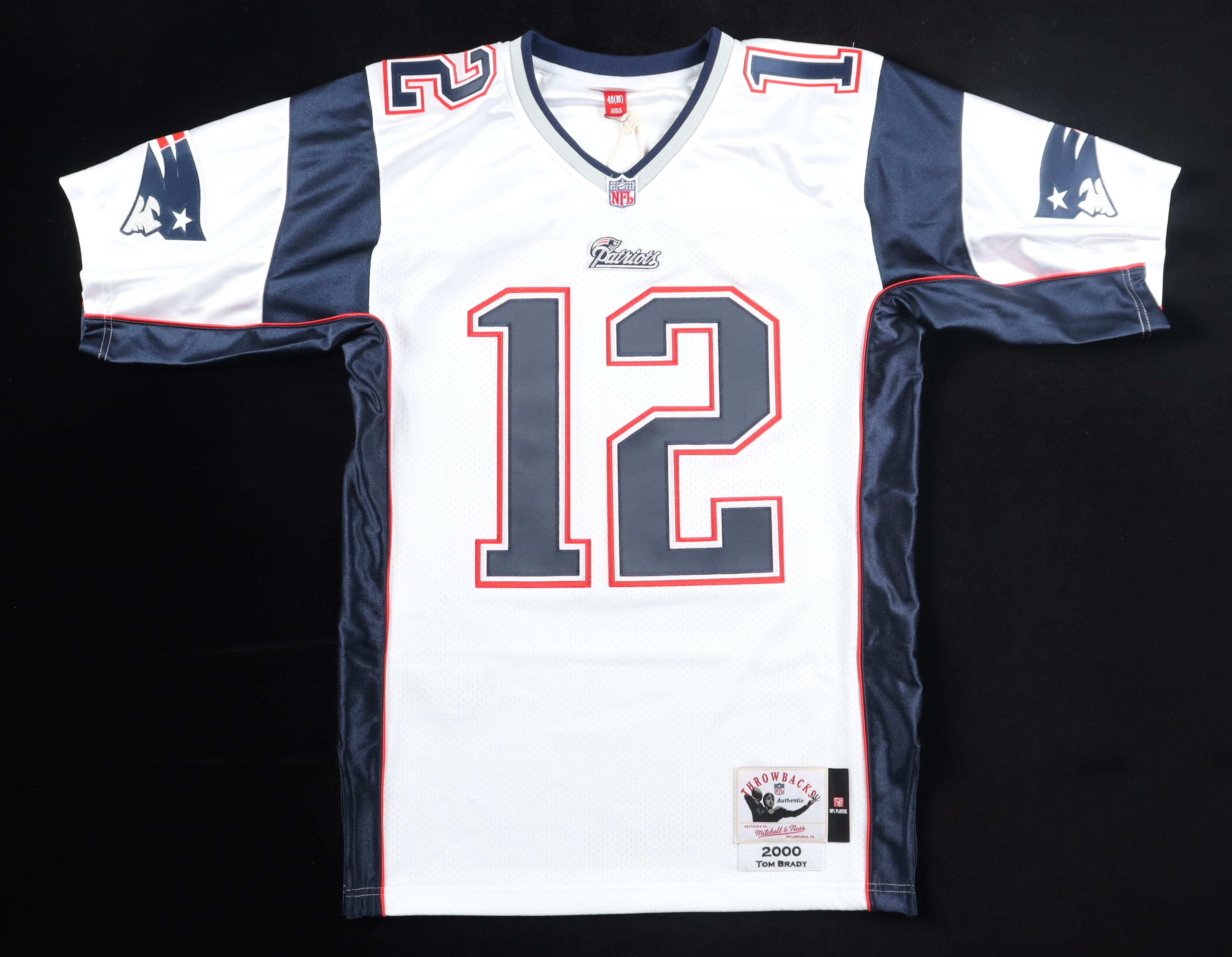 Mitchell & Ness jersey with everything sewn on, size M. Hand-signed by Tom Brady (New England Patriots).