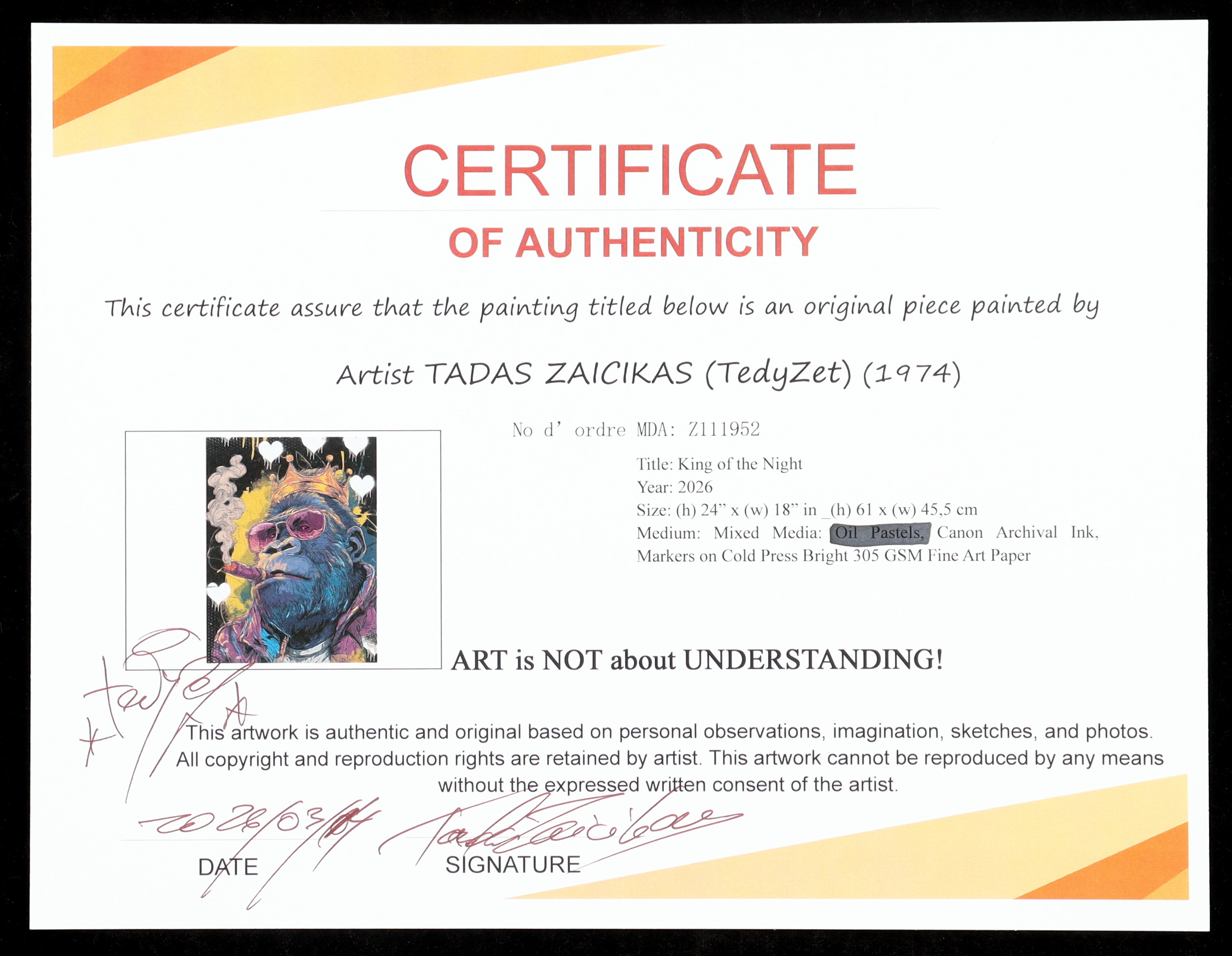 The piece includes an official Tadas Zaicikas COA for authenticity purposes.