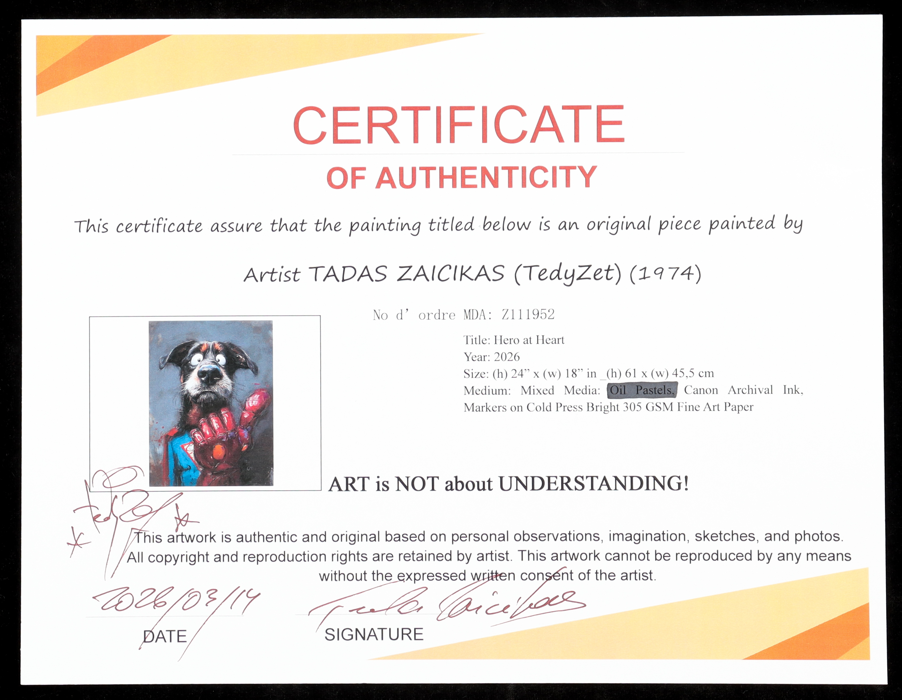 The piece includes an official Tadas Zaicikas COA for authenticity purposes.