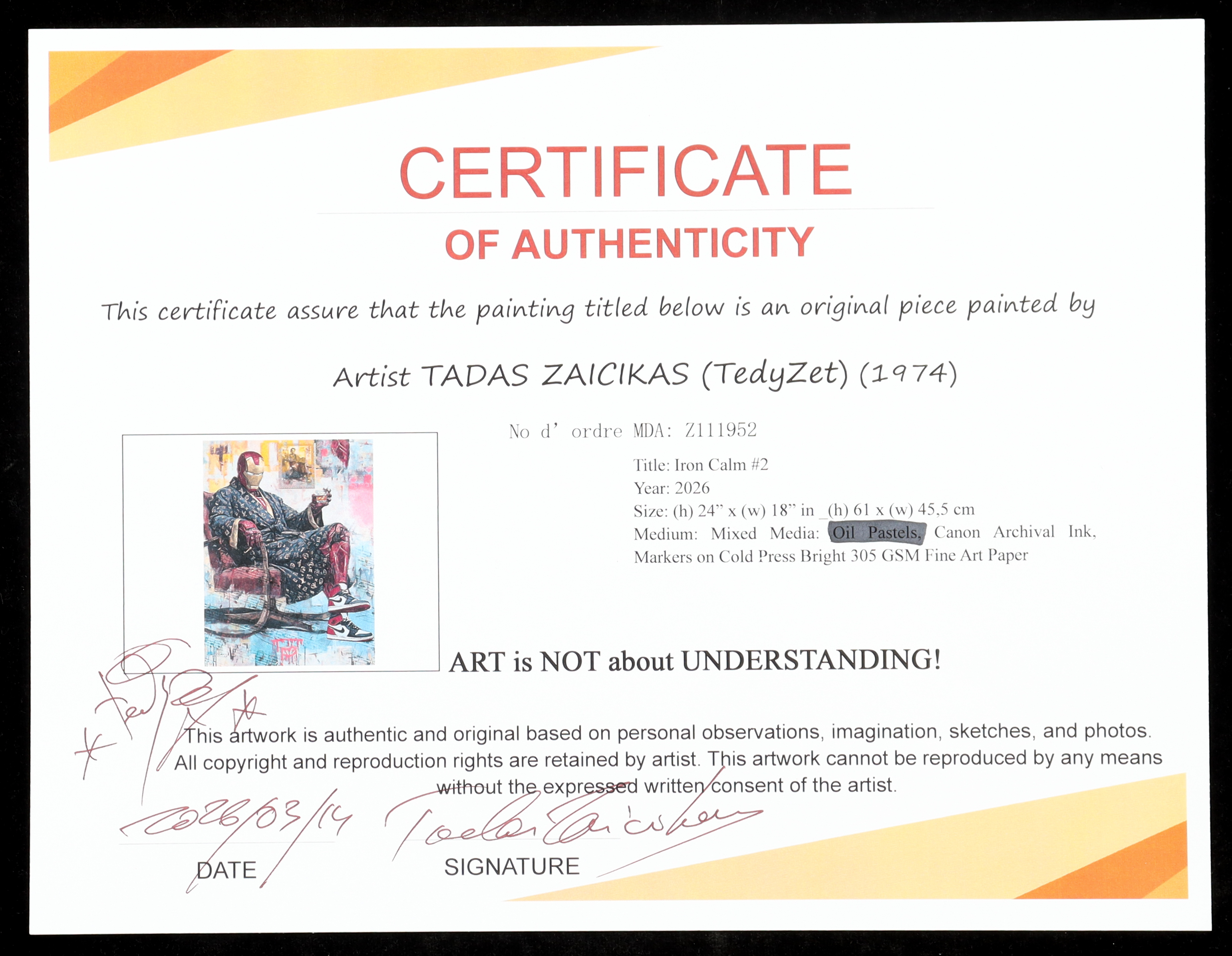 The piece includes an official Tadas Zaicikas COA for authenticity purposes.