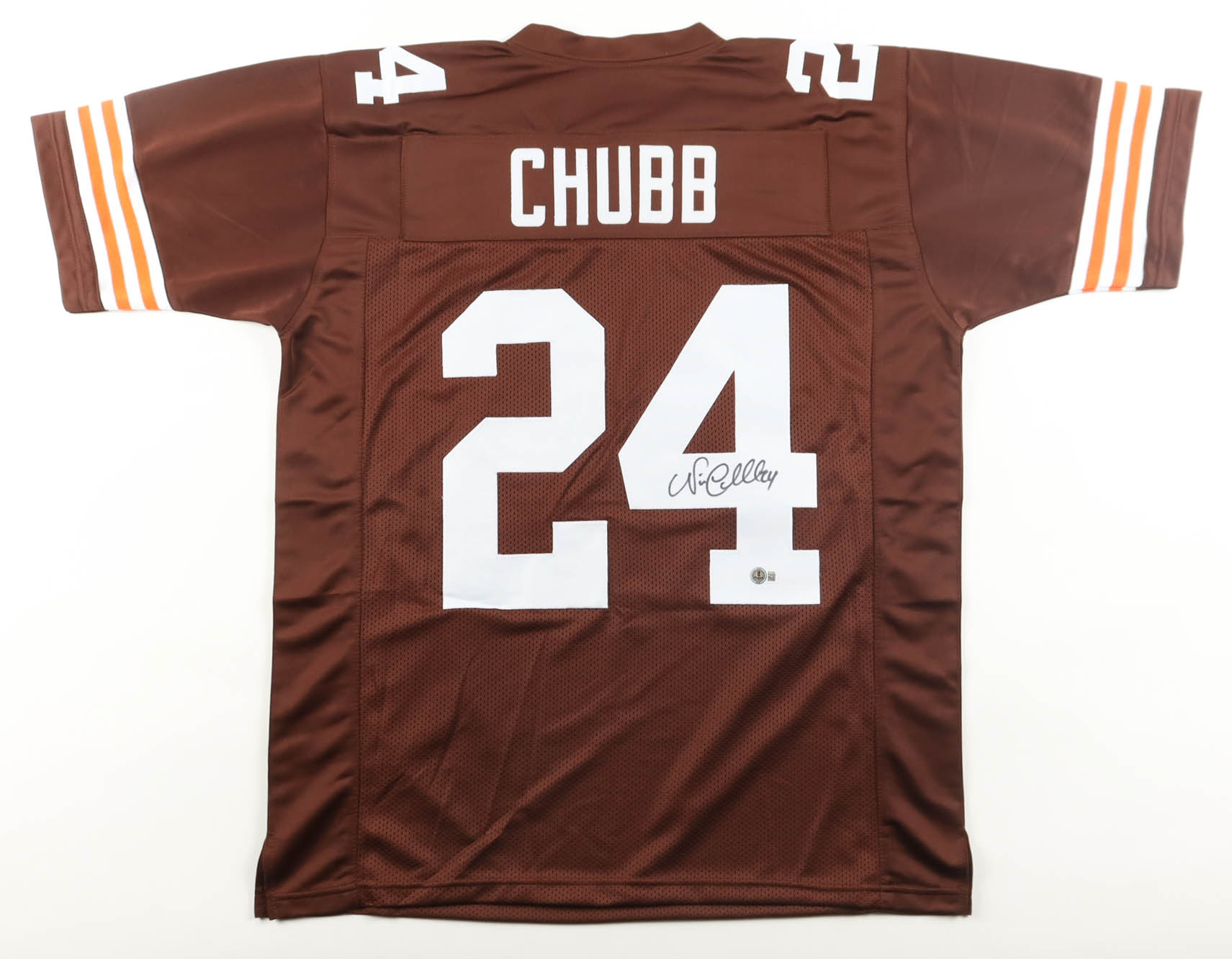 Jersey with everything sewn on, size XL. Hand-signed by Nick Chubb.