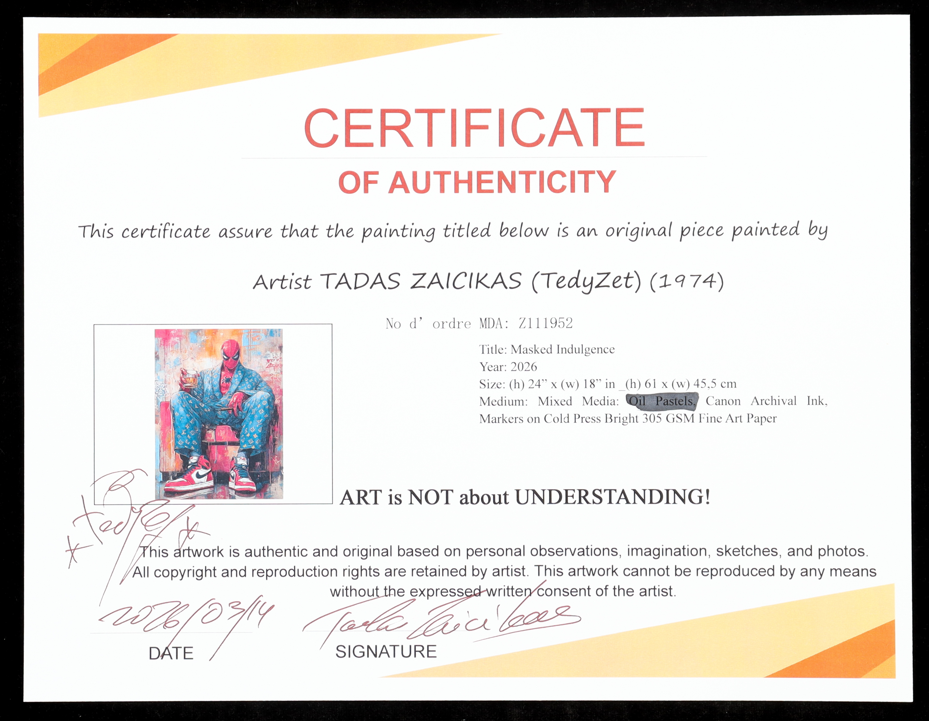 The piece includes an official Tadas Zaicikas COA for authenticity purposes.