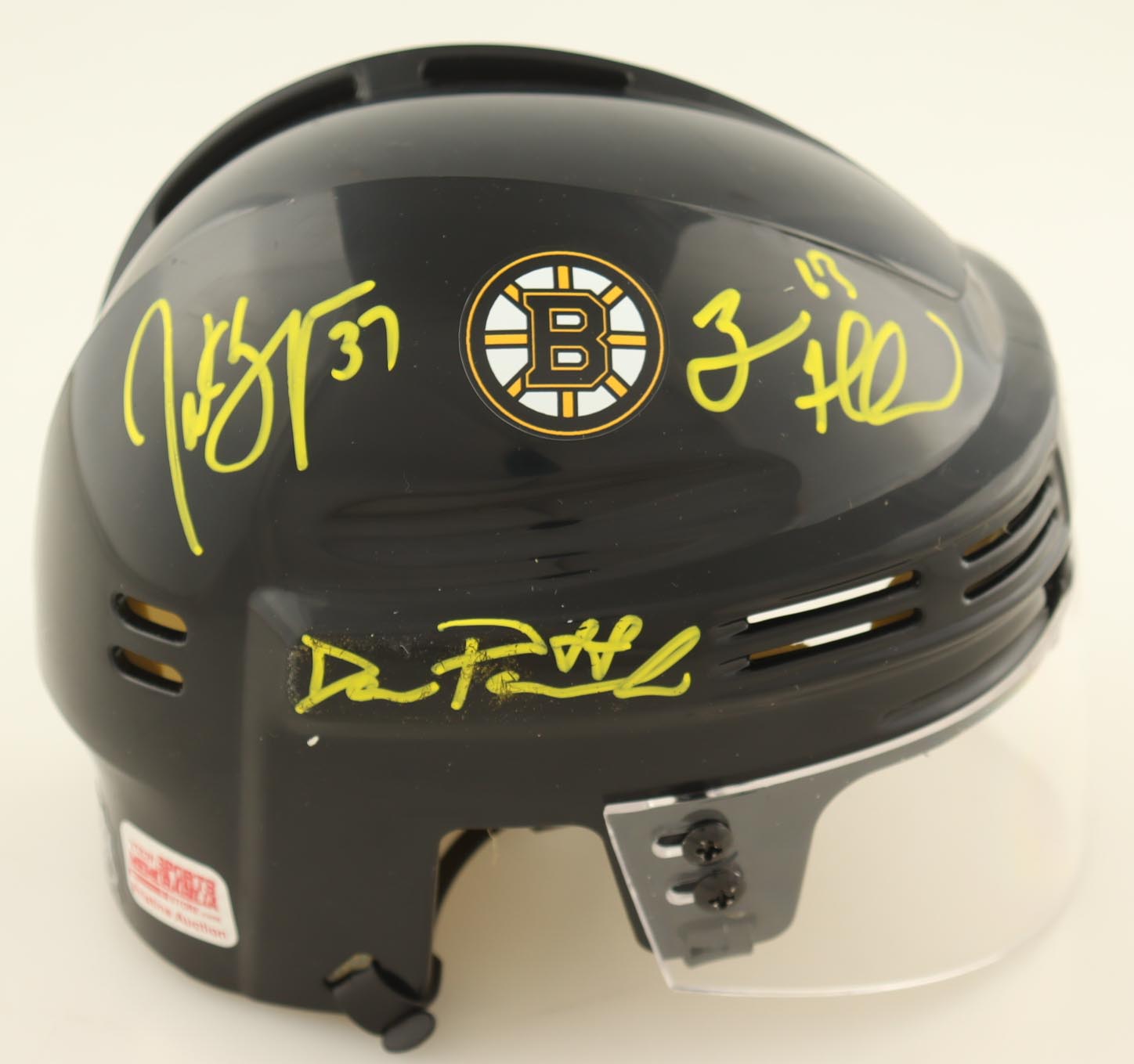 Boston Bruins mini helmet has been hand-signed by Patrice Bergeron, Brad Marchand and David Pastrnak.
