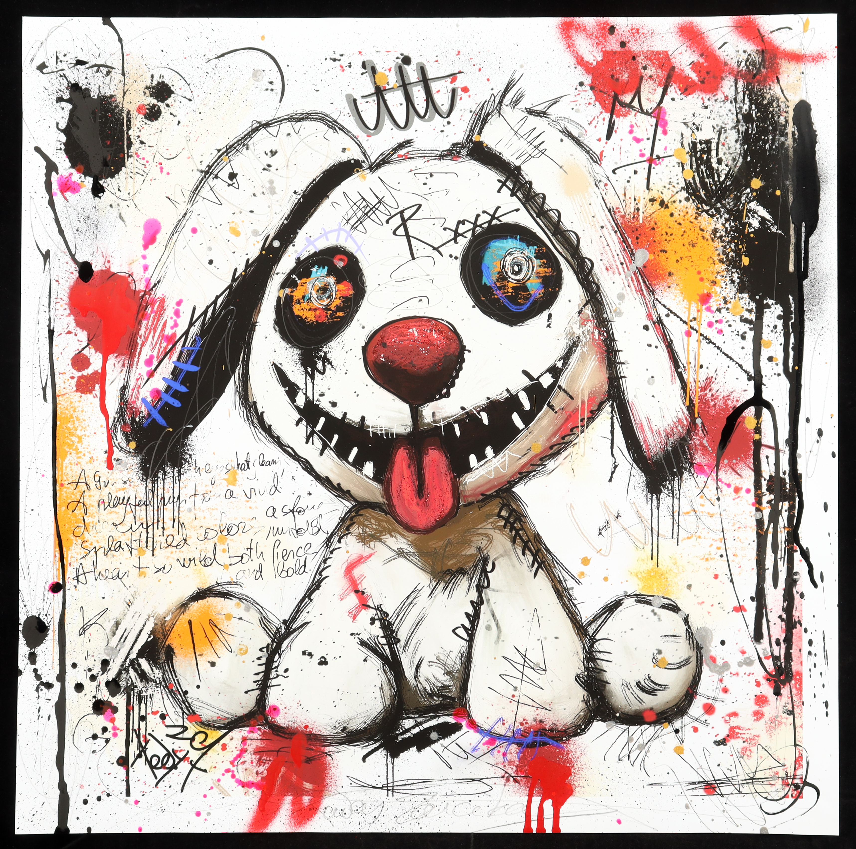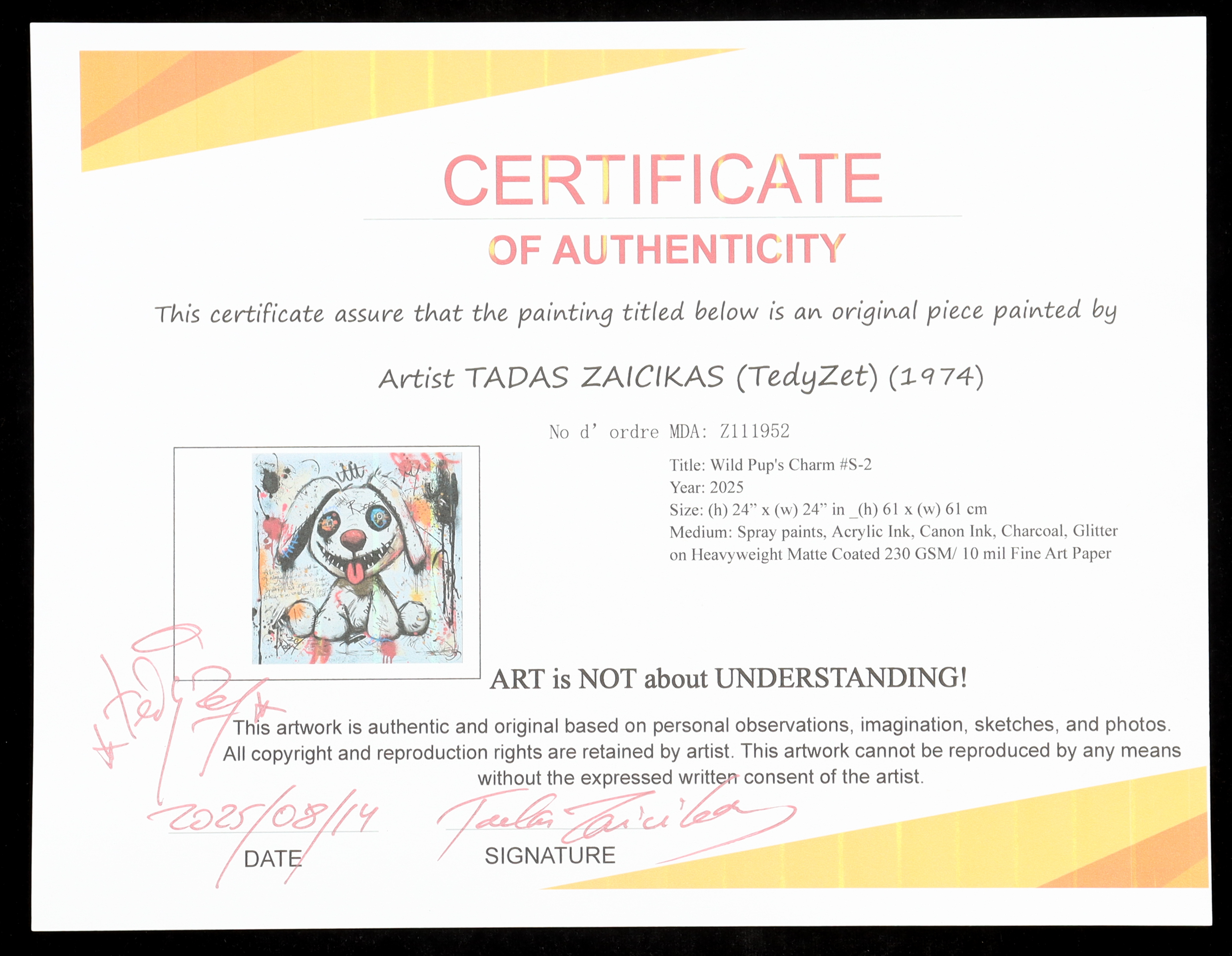 This original painting of acrylic ink, canon ink, charcoal, and glitter on heavyweight matte coated 230 GSM fine art paper. Art print measures 24" x 24" in size and has been hand-signed and titled by the artist, Tadas Zaicikas (TedyZet).