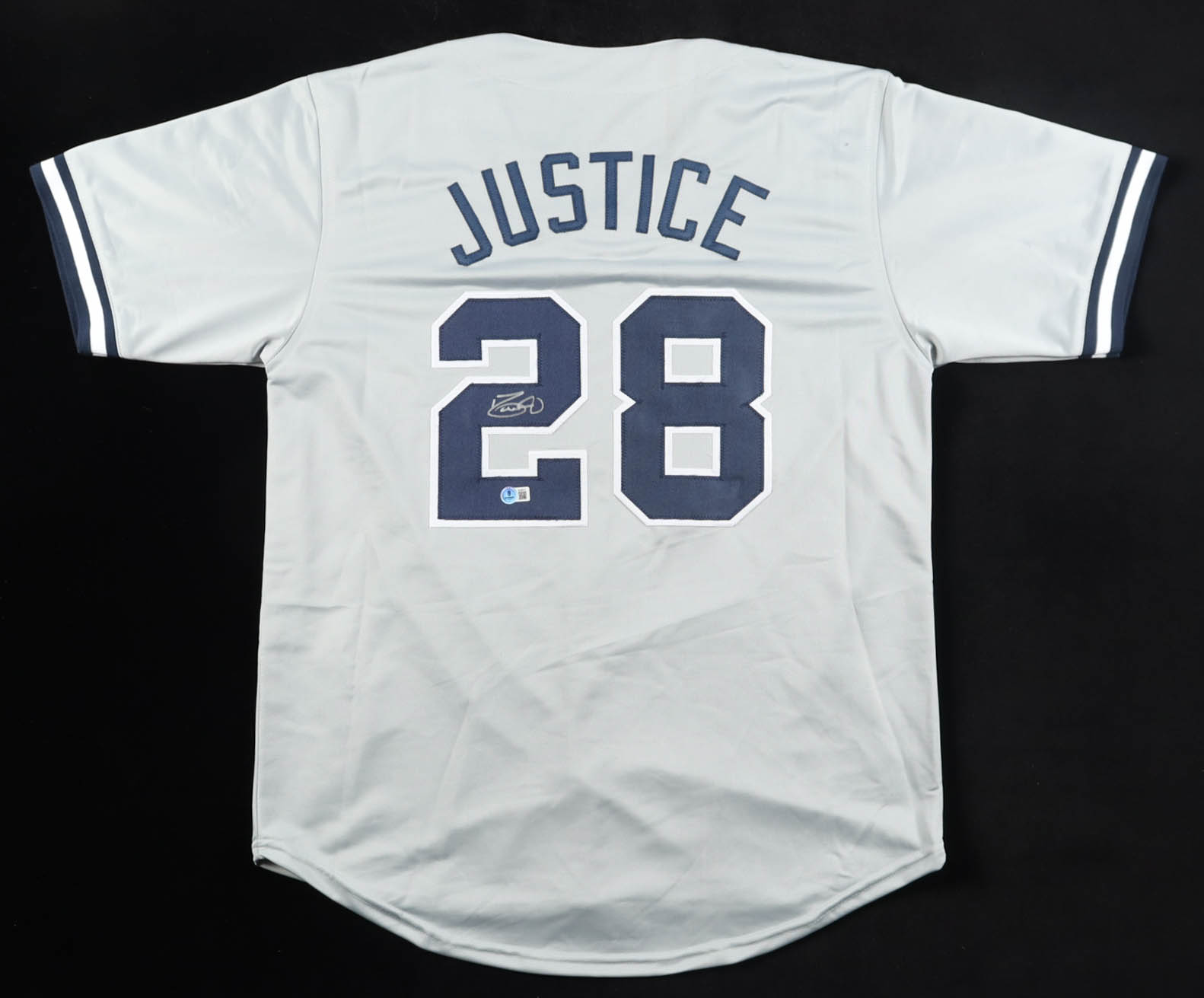 Custom jersey with everything sewn on, size XL. Hand-signed by David Justice.