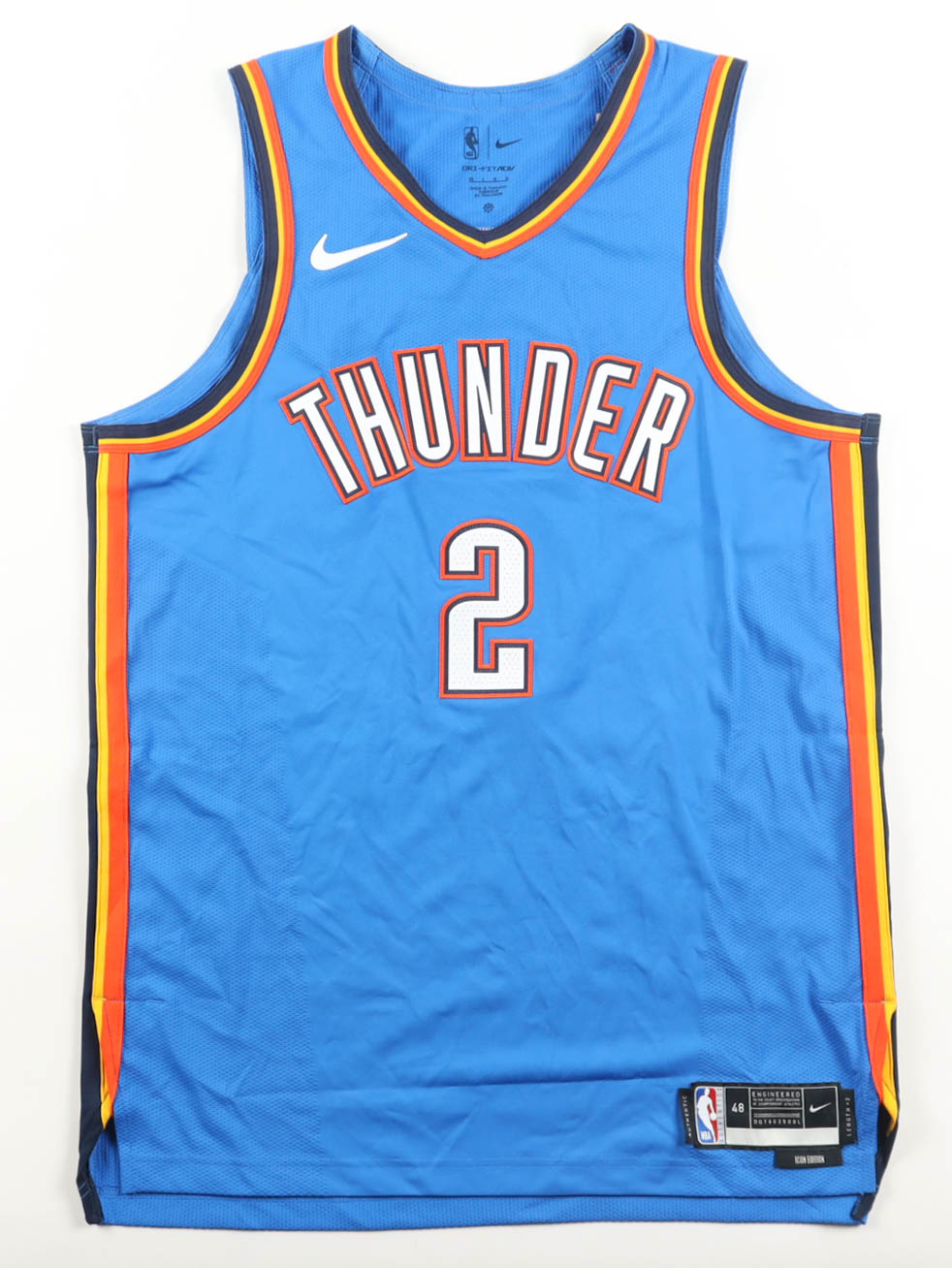Nike authentic jersey with everything sewn on, size 48. Hand-signed by Shai Gilgeous-Alexander (Oklahoma City Thunder). Please note, there is a stain below the players name. See photos regarding the condition of the item.