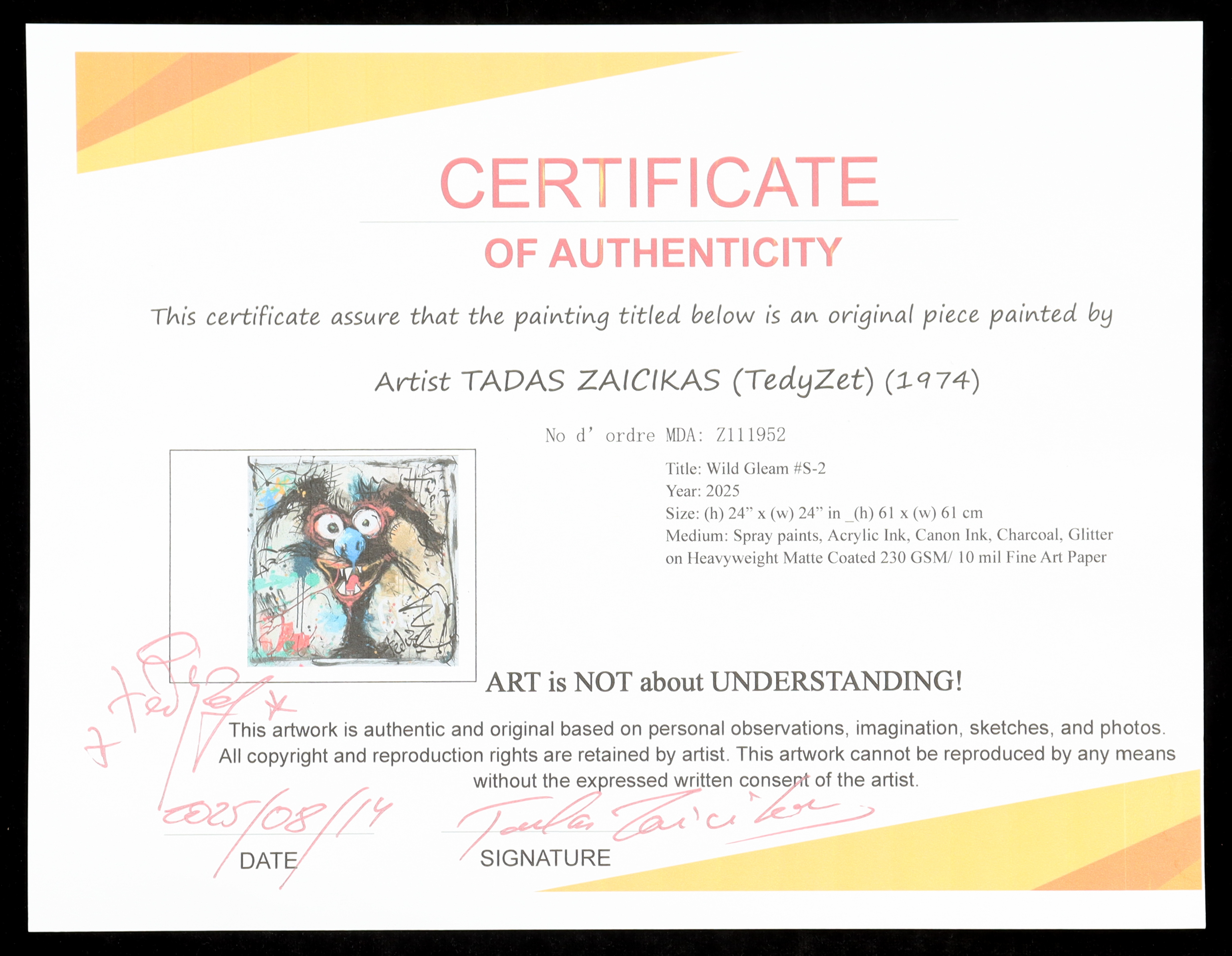 This original painting of acrylic ink, canon ink, charcoal, and glitter on heavyweight matte coated 230 GSM fine art paper. Art print measures 24" x 24" in size and has been hand-signed and titled by the artist, Tadas Zaicikas (TedyZet).