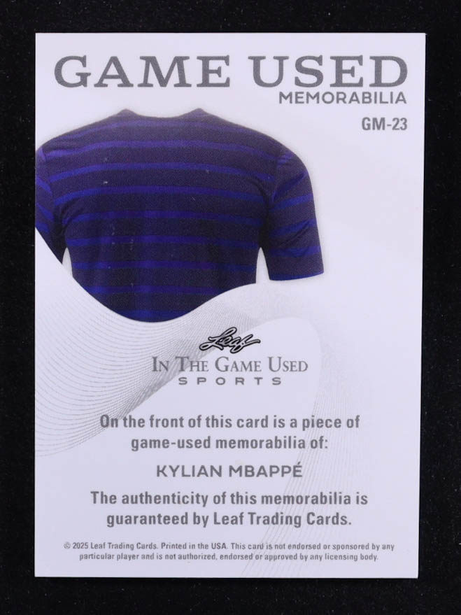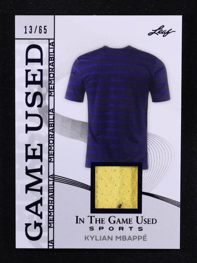 Kylian Mbappe 2025 Leaf ITG Used Sports Game Used Memorabilia Blue Foil JSY #GM23 #13/65