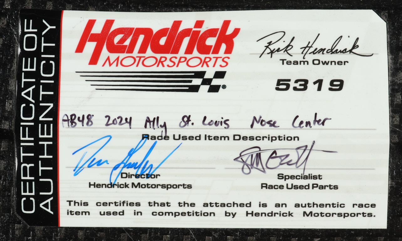 Race-Used Center Nose Car Piece from Alex Bowman's #48 Ally used during the 2024 World Wide Technology Raceway. Authenticated by the Director and Race Used Parts Specialist at Hendrick Motorsports.