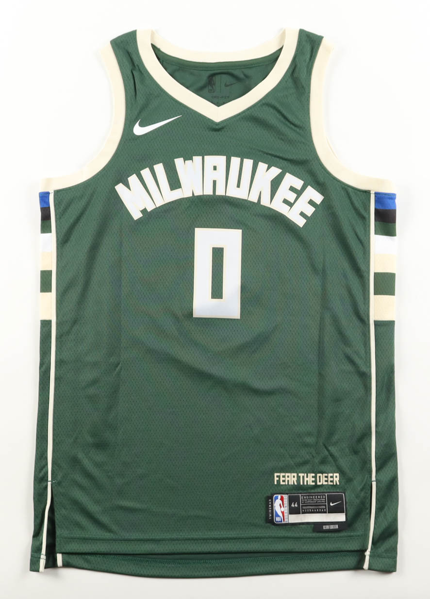 Nike authentic jersey with everything pressed on, size 44. Hand-signed and inscribed by Damian Lillard (Milwaukee Bucks).