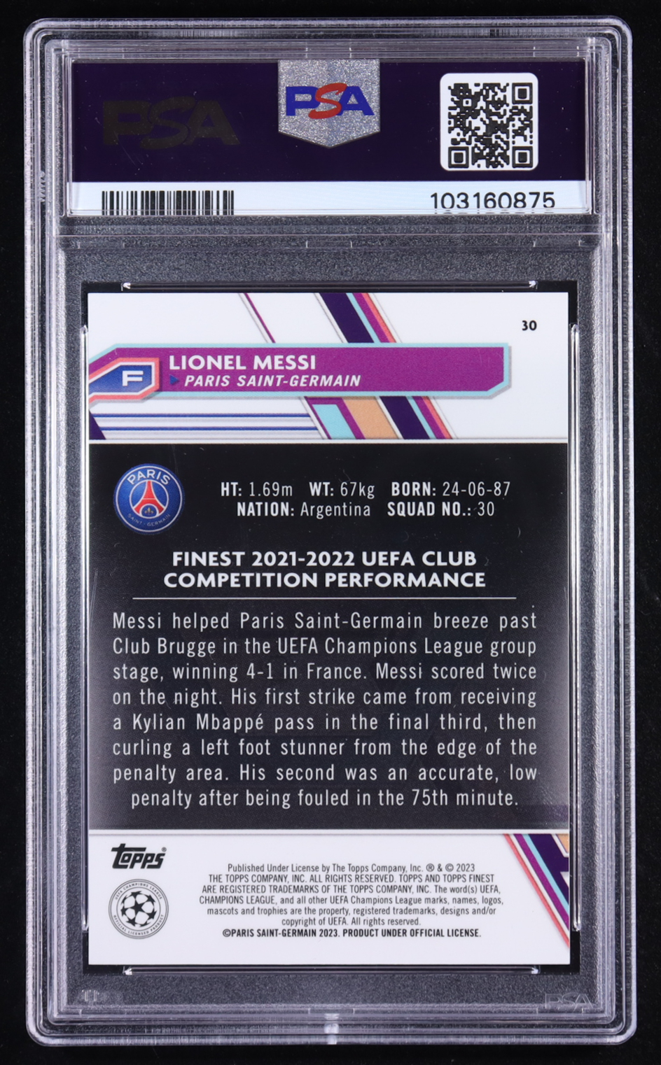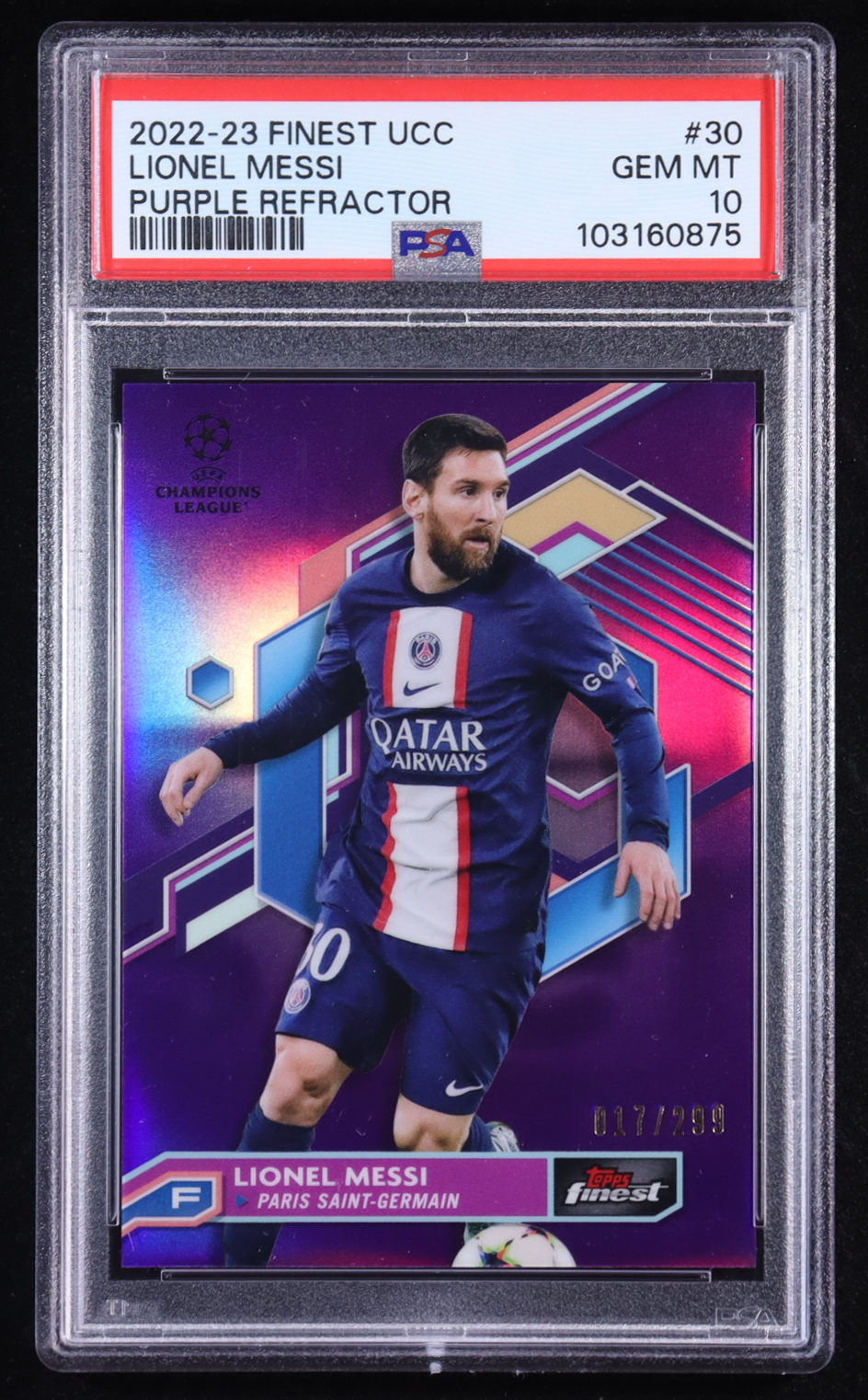 Lionel Messi 2022-23 Topps Finest UCC Purple Refractor #30 #017/299 (PSA 10)