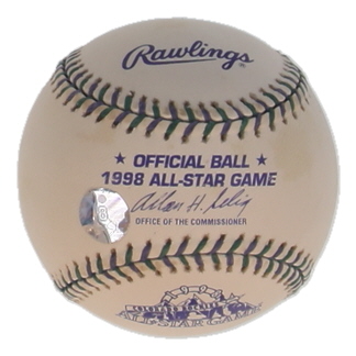 Rawlings Official 1998 All-Star Game logo baseball. Hand-signed by Cal Ripken Jr. (Baltimore Orioles, HOF). Limited edition hand-numbered #84/350. Please note, the ball is naturally toned and stained throughout.