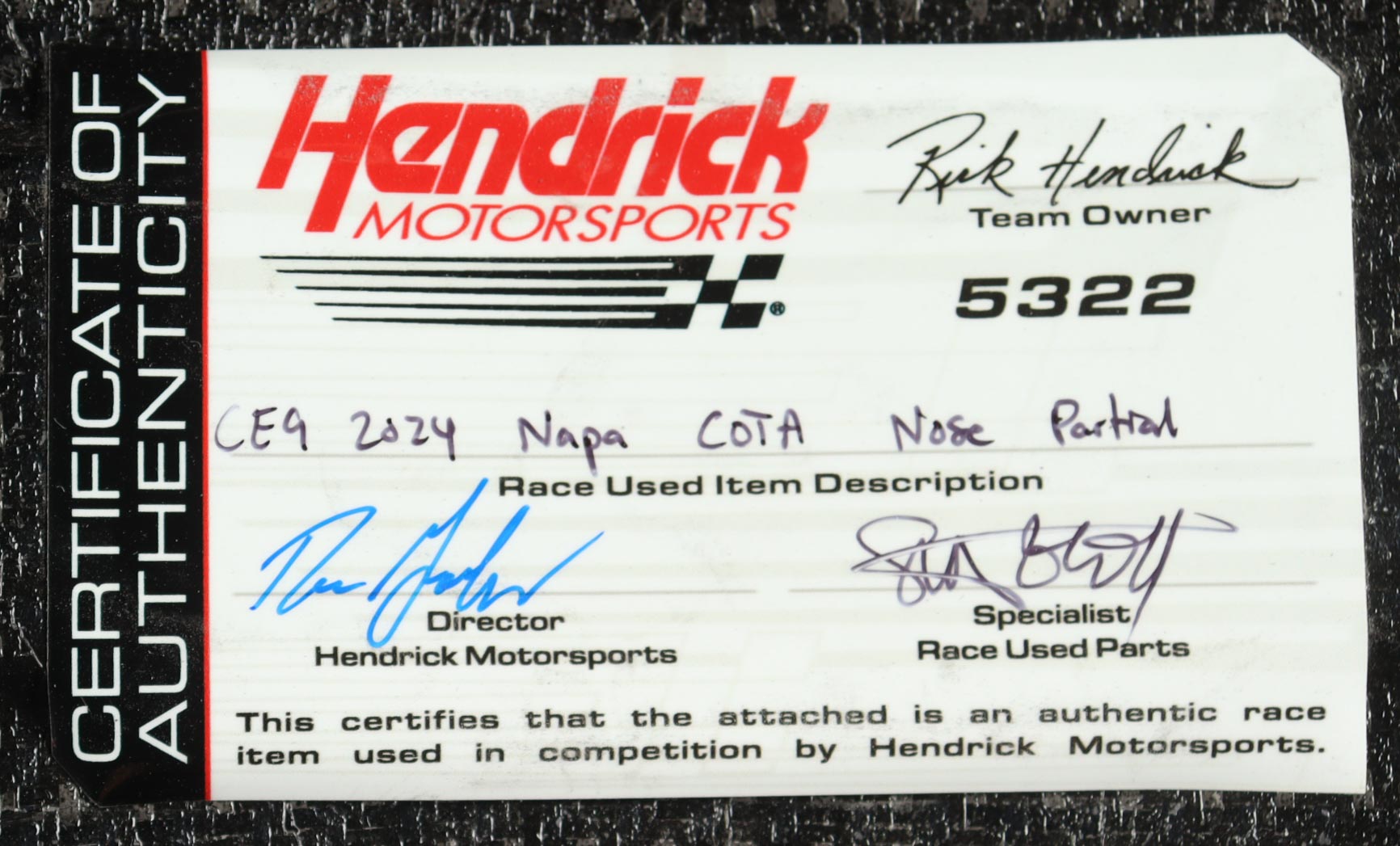 Race-Used Partial Nose Car Piece from Chase Elliott's #9 NAPA Auto Parts used during the 2024 Circuit of the Americas. Authenticated by the Director and Race Used Parts Specialist at Hendrick Motorsports.