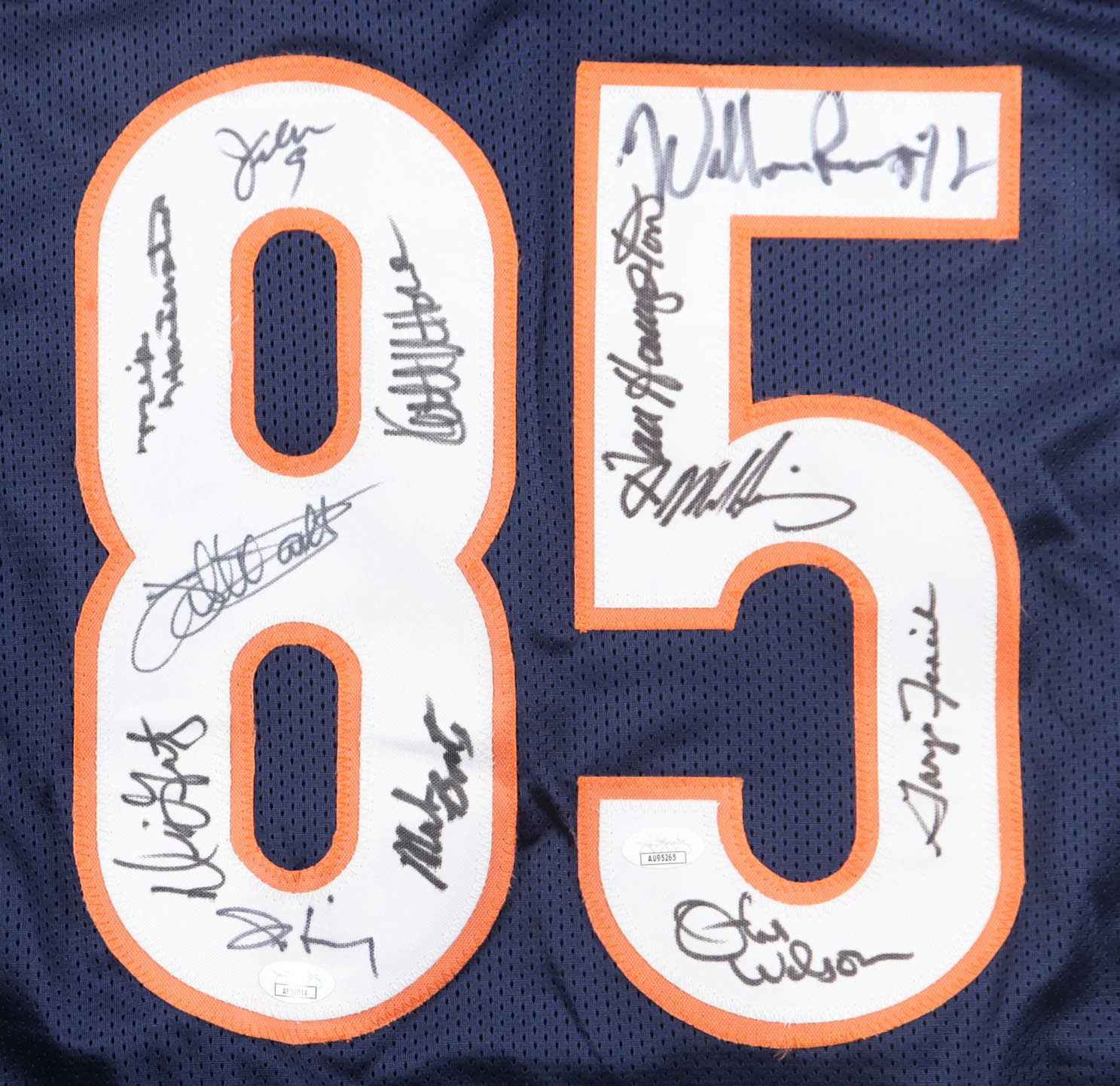 Custom jersey with everything sewn on, size XL. Hand-signed by (12) including William Perry, Dan Hampton (HOF), Mike Singletary (HOF), Otis Wilson, Gary Fencik, Mark Bortz, Dennis Gentry, Mike Hartenstine, Jay Hilgenberg, Willie Gault, Keith Van Horne and Jim McMahon.