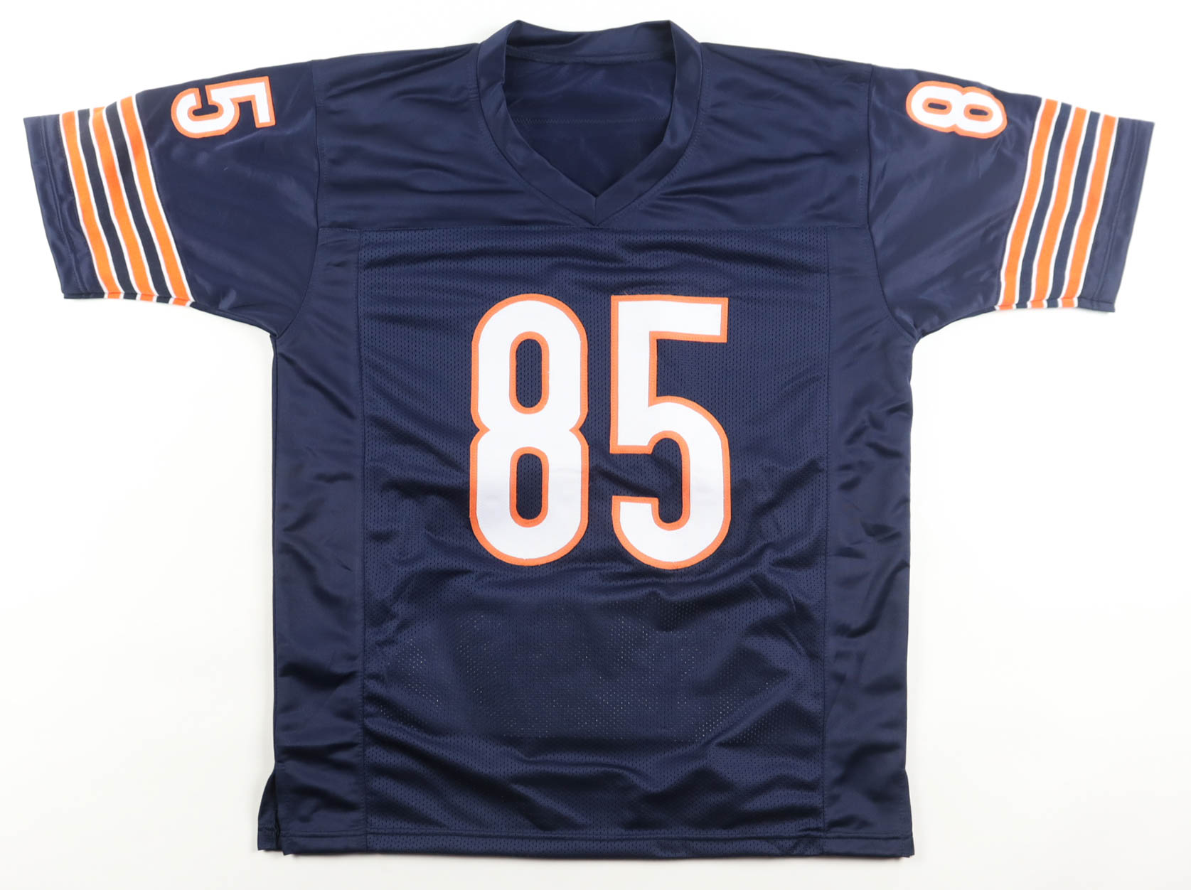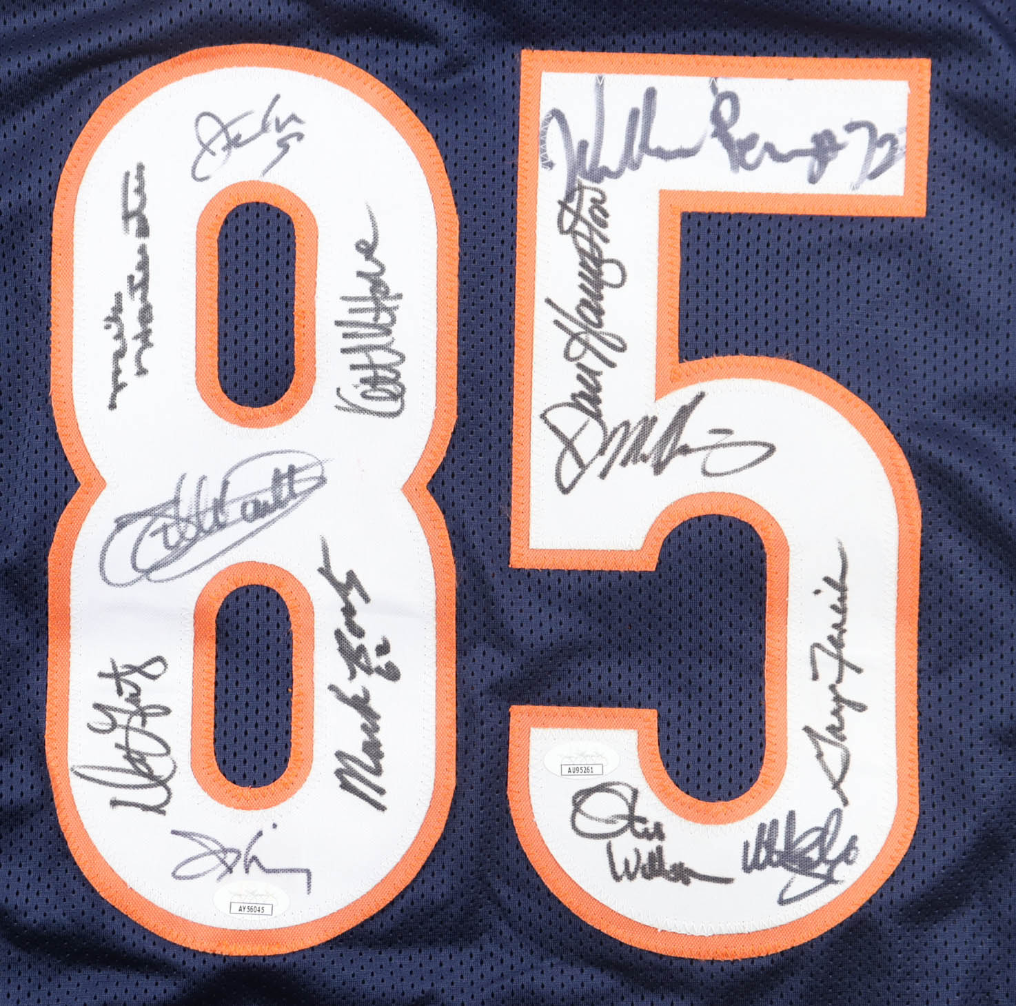 Custom jersey with everything sewn on, size XL. Hand-signed by (12) including William Perry, Dan Hampton (HOF), Mike Singletary (HOF), Otis Wilson, Gary Fencik, Mark Bortz, Dennis Gentry, Mike Hartenstine, Jay Hilgenberg, Willie Gault, Keith Van Horne and Jim McMahon.