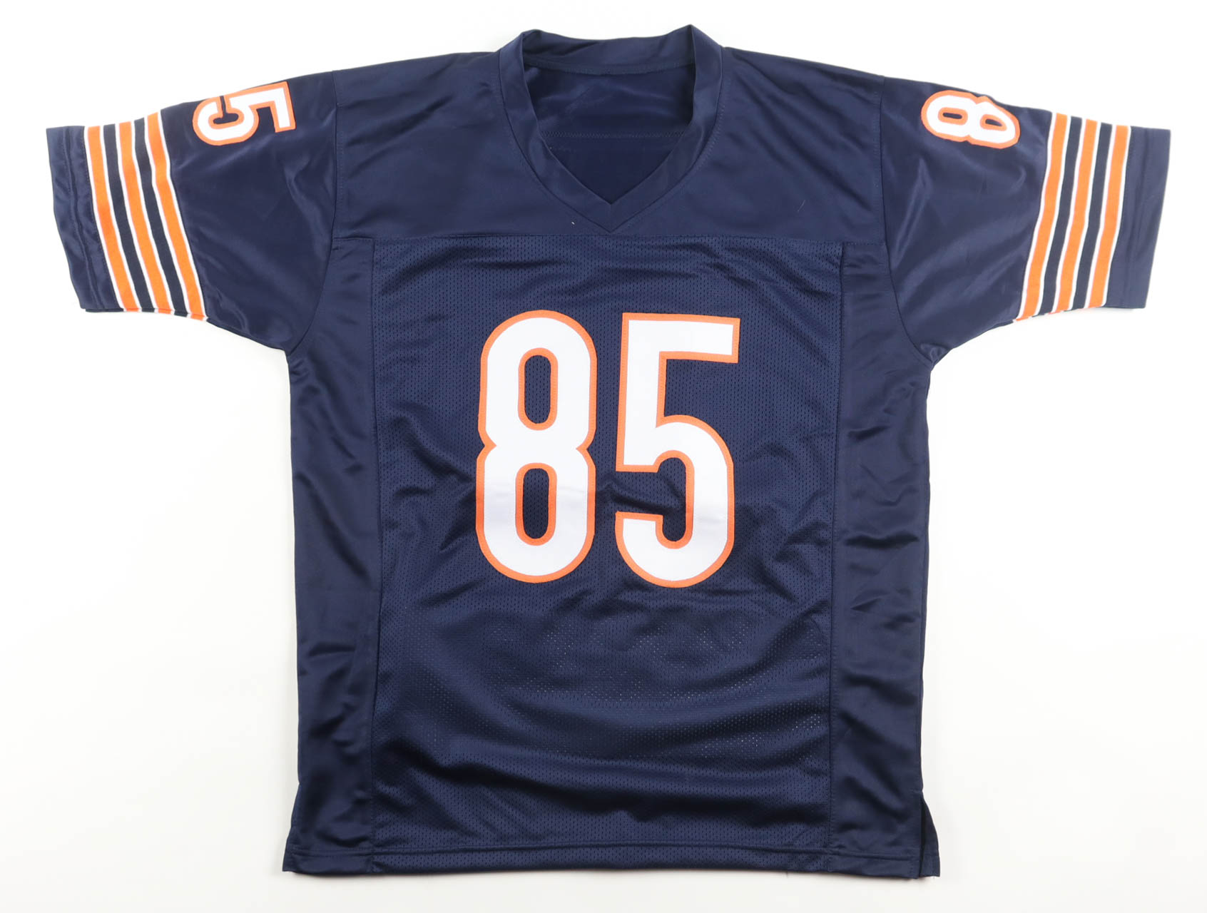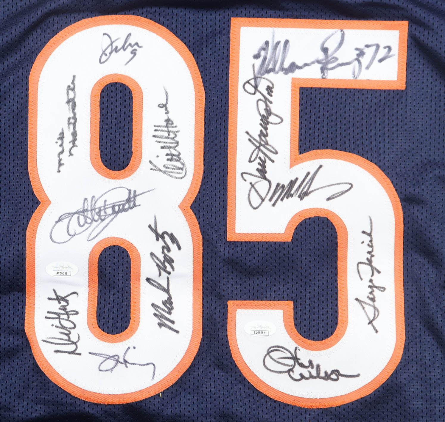 Custom jersey with everything sewn on, size XL. Hand-signed by (12) including William Perry, Dan Hampton (HOF), Mike Singletary (HOF), Otis Wilson, Gary Fencik, Mark Bortz, Dennis Gentry, Mike Hartenstine, Jay Hilgenberg, Willie Gault, Keith Van Horne and Jim McMahon.