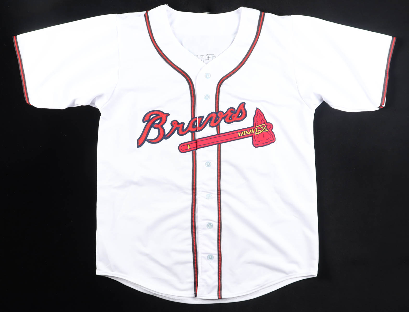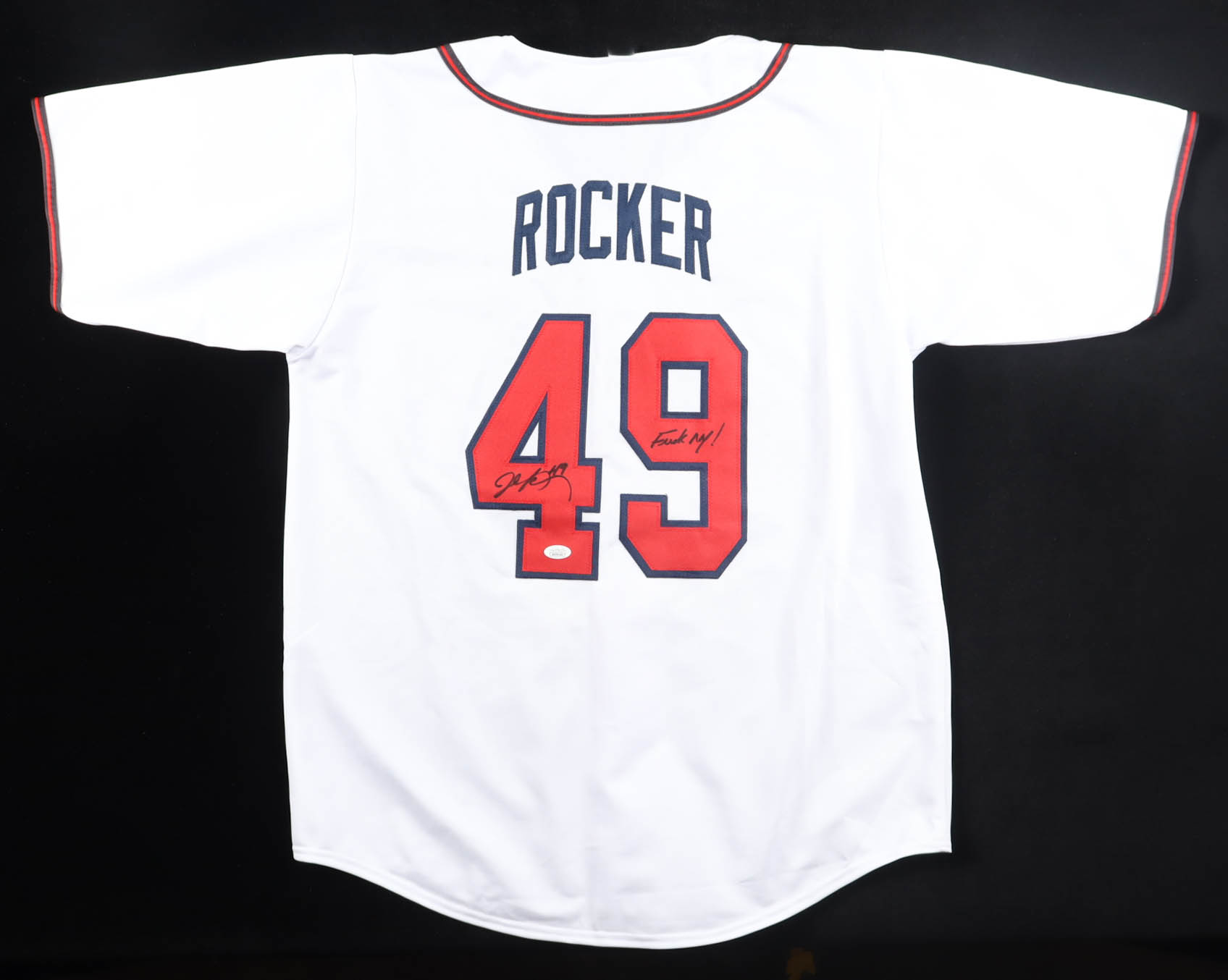 Custom jersey with everything sewn on, size XL. Hand-signed and inscribed by John Rocker (Atlanta Braves).